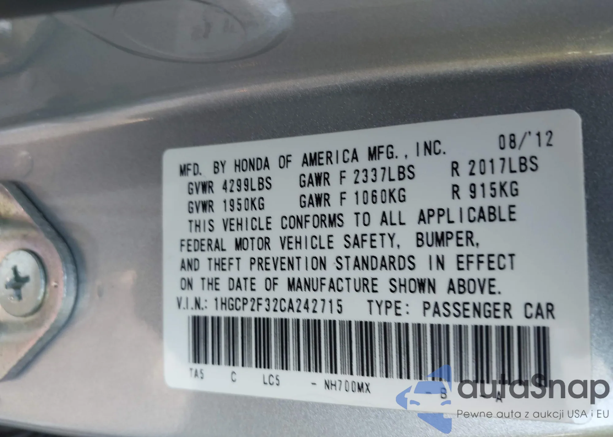 LOT: 43342093 VIN: 1HGCP2F32CA242715
