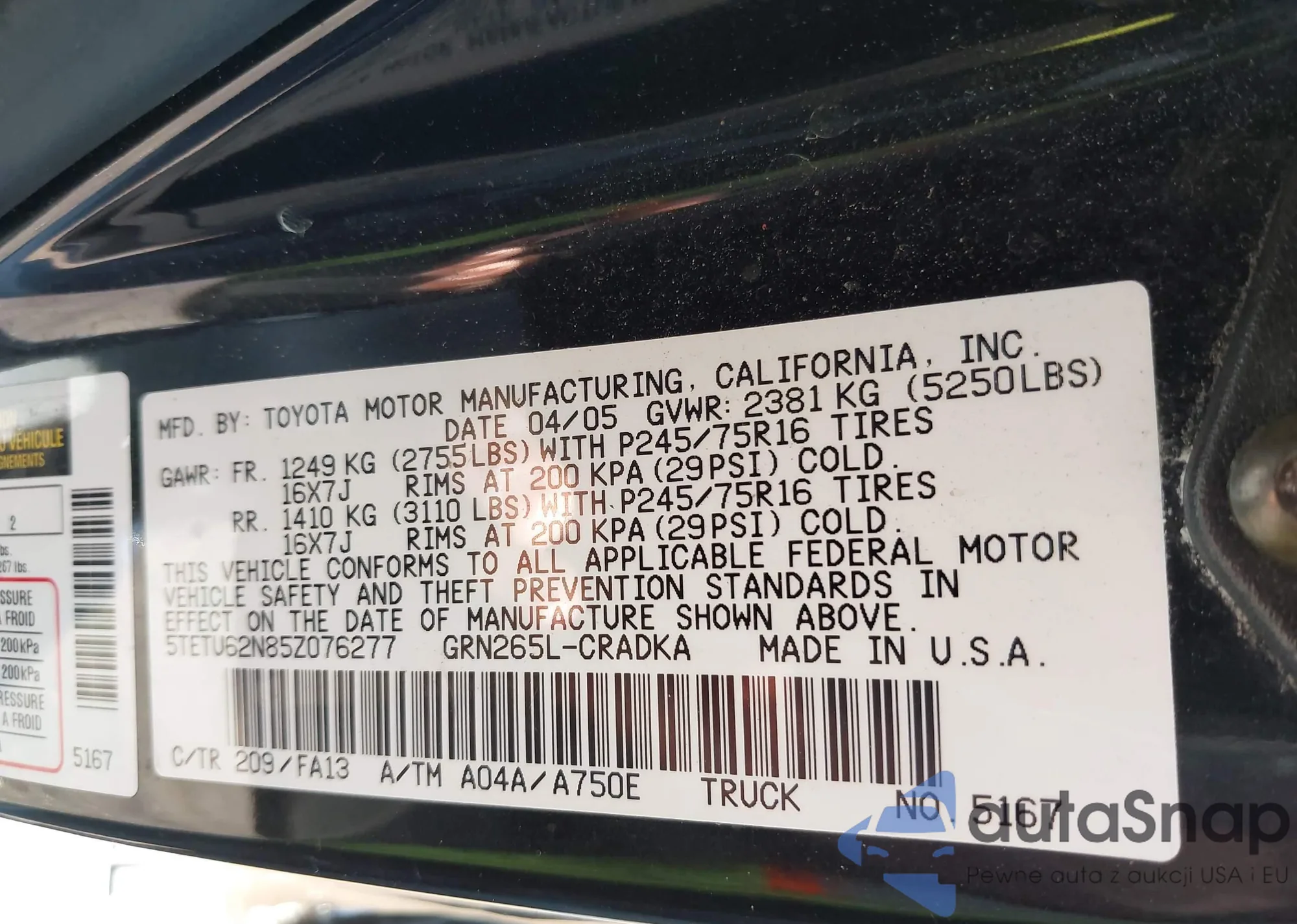 • VIN 5TETU62N85Z076277