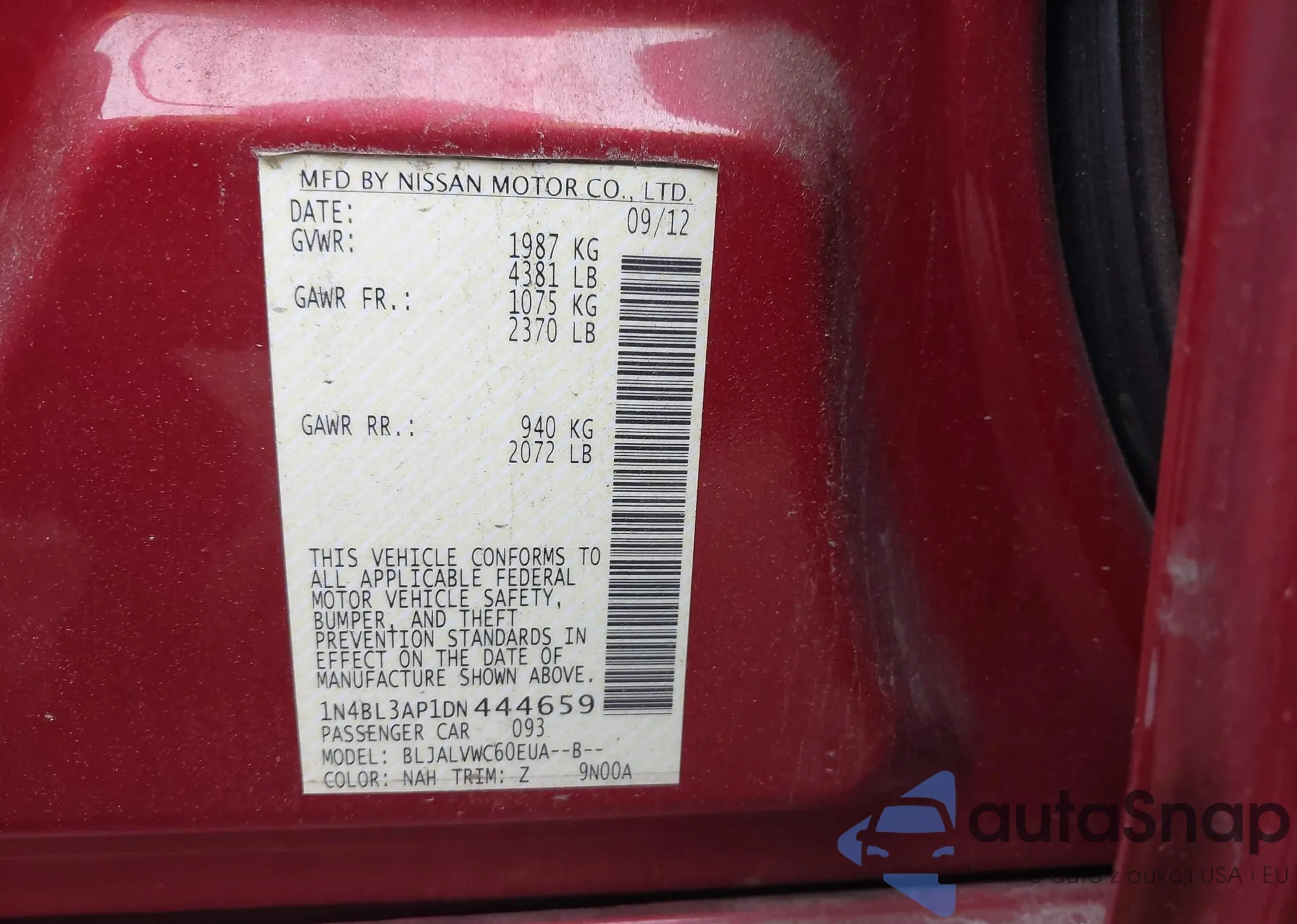 LOT: 43165819 VIN: 1N4BL3AP1DN444659