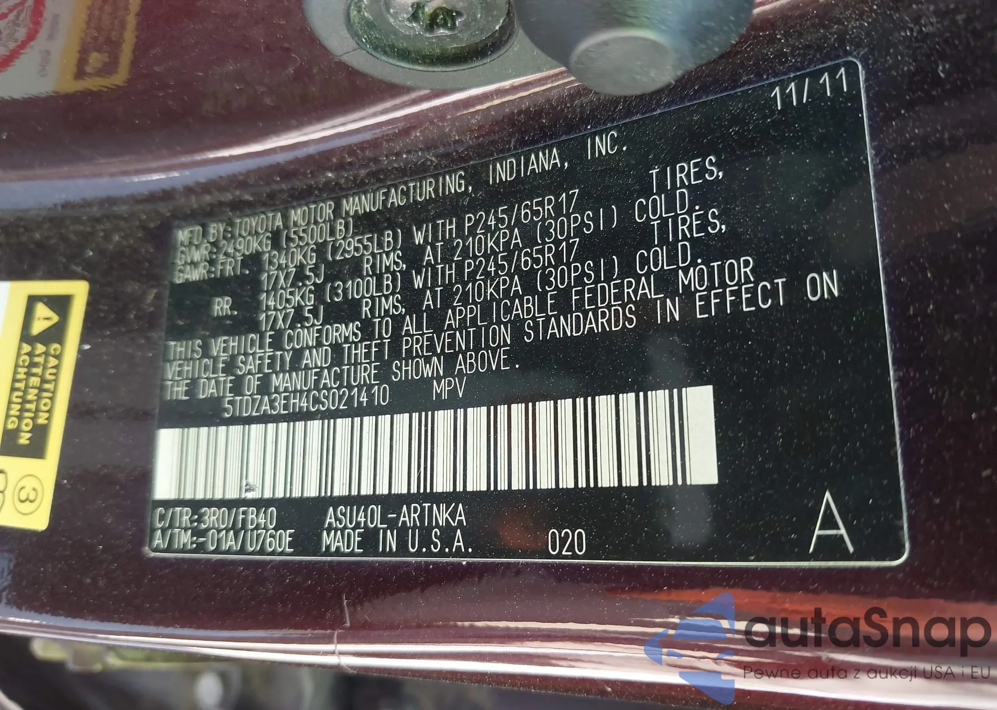 • VIN 5TDZA3EH4CS021410