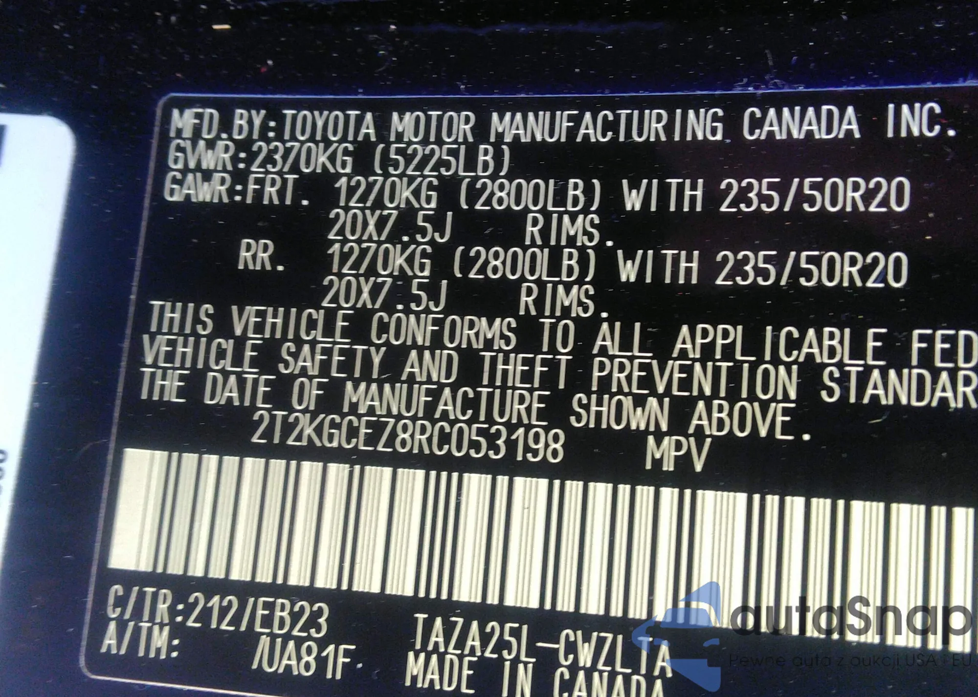 LOT: 43187429 VIN: 2T3K1RFV4NW229605