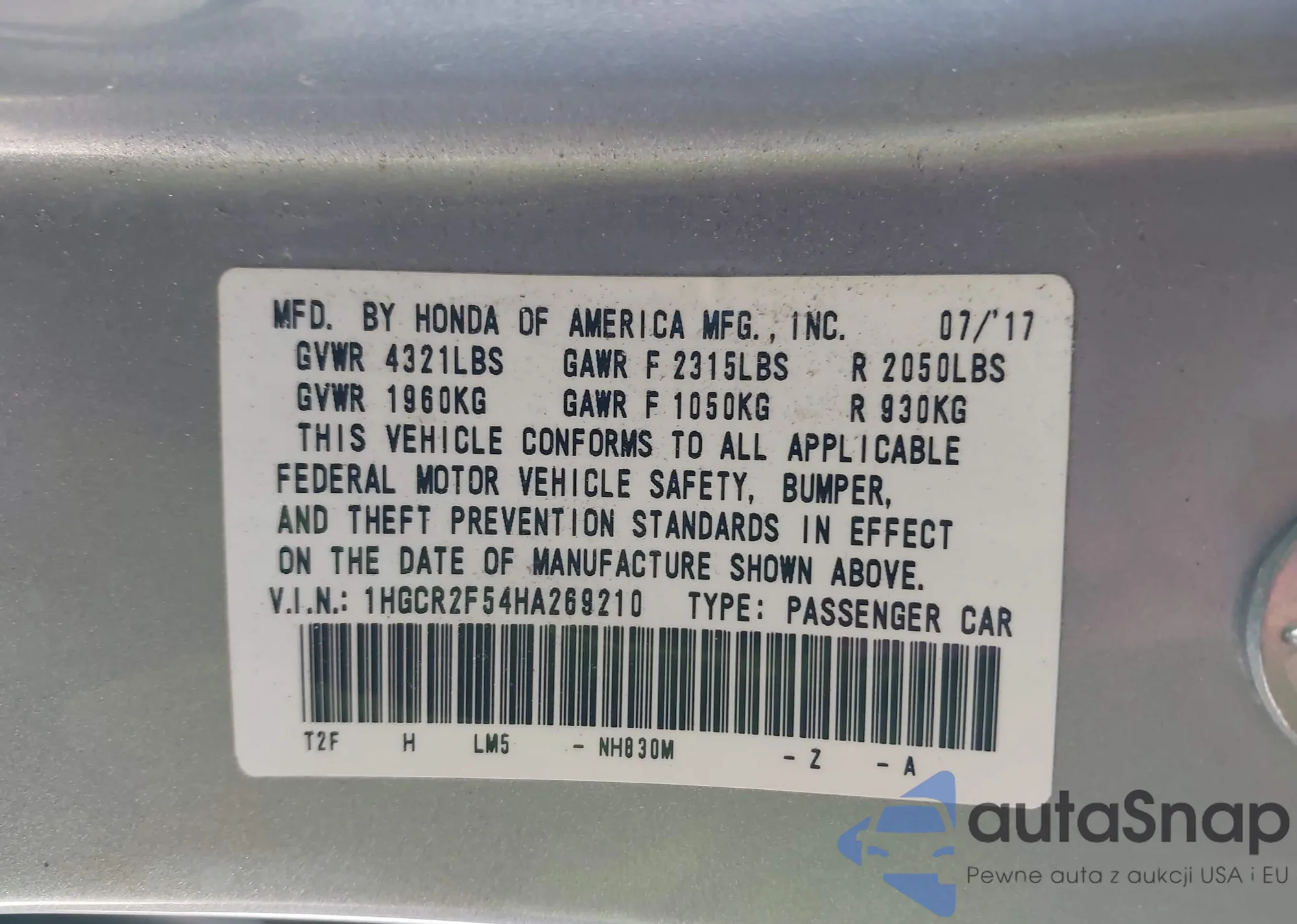 • VIN 1HGCR2F54HA269210