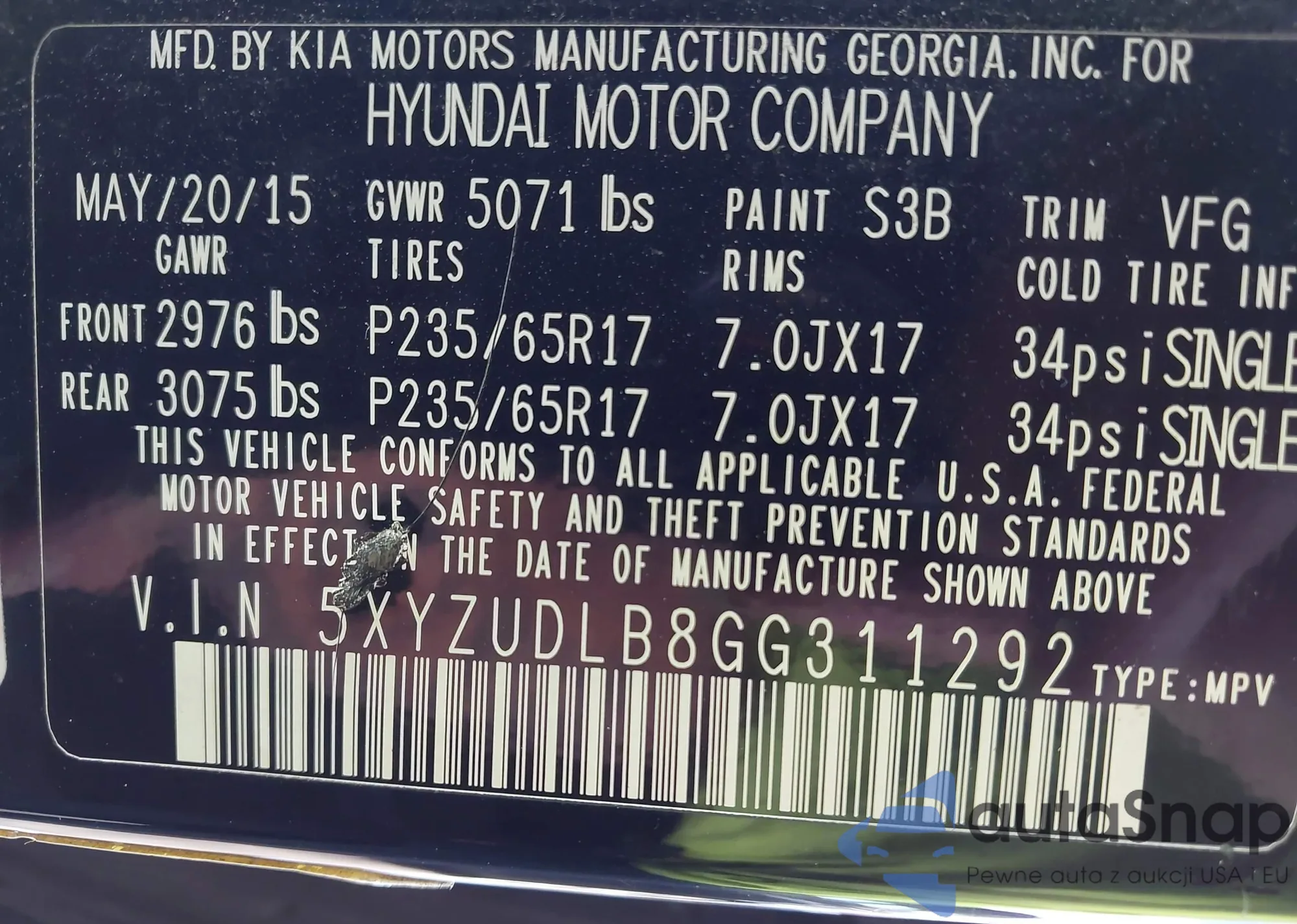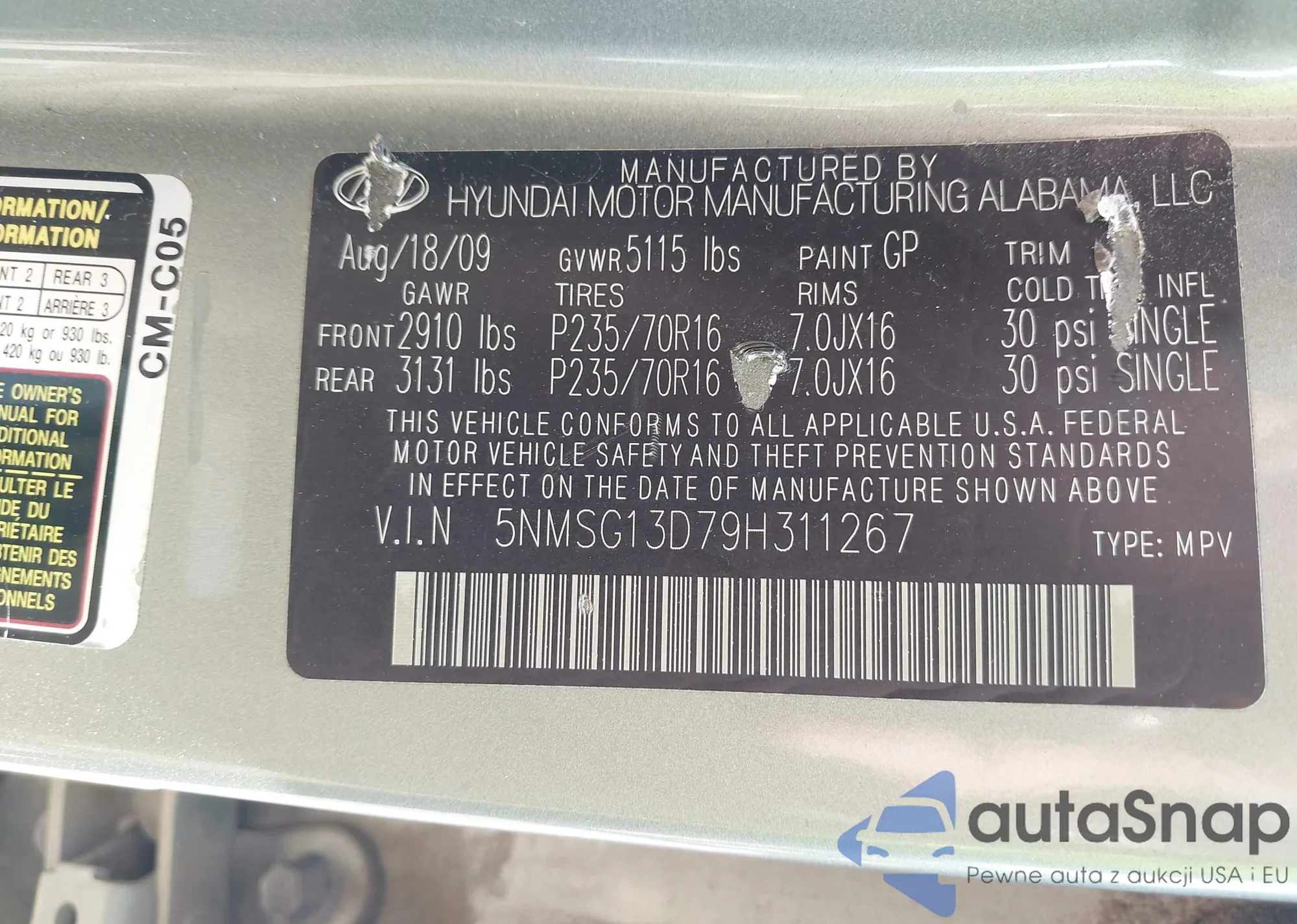 LOT: 43182878 VIN: 5NMSG13D79H311267