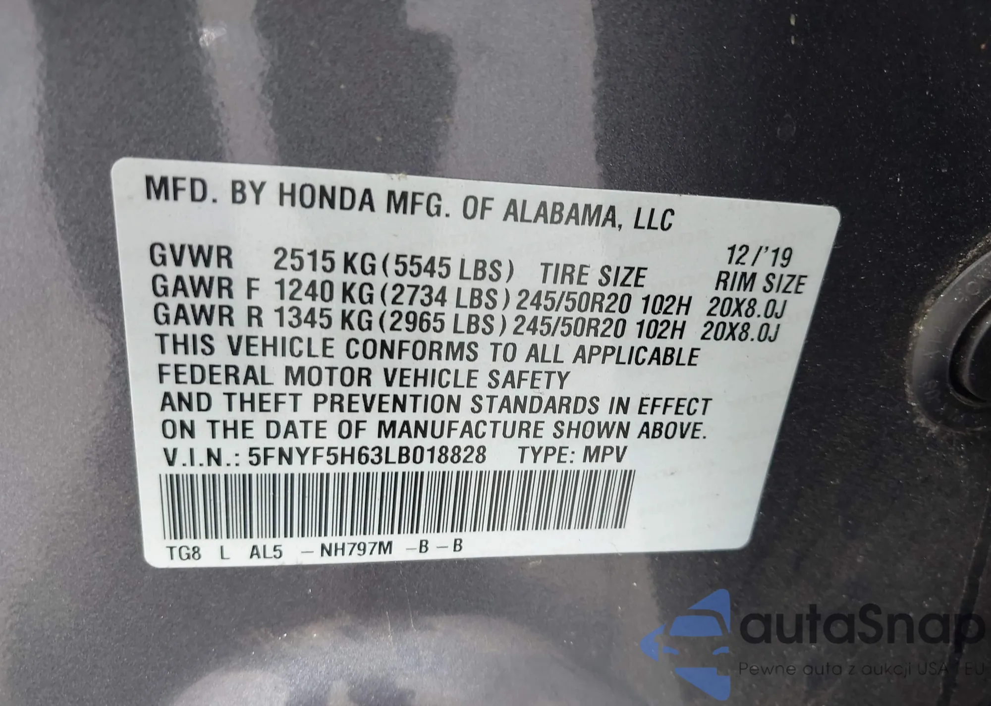 LOT: 43472829 VIN: 5FNRL5H68CB117867