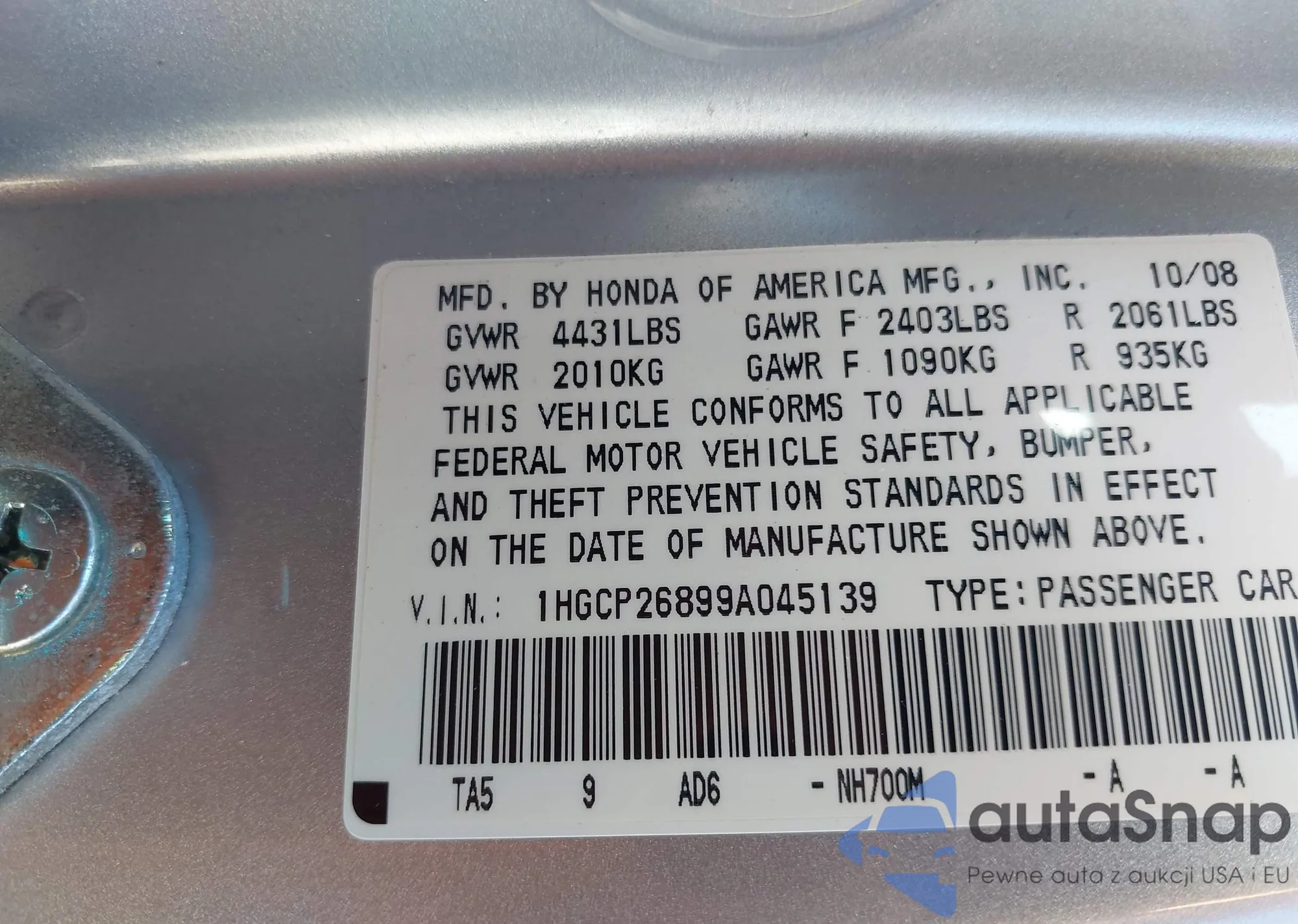 • VIN 1HGCP26899A045139