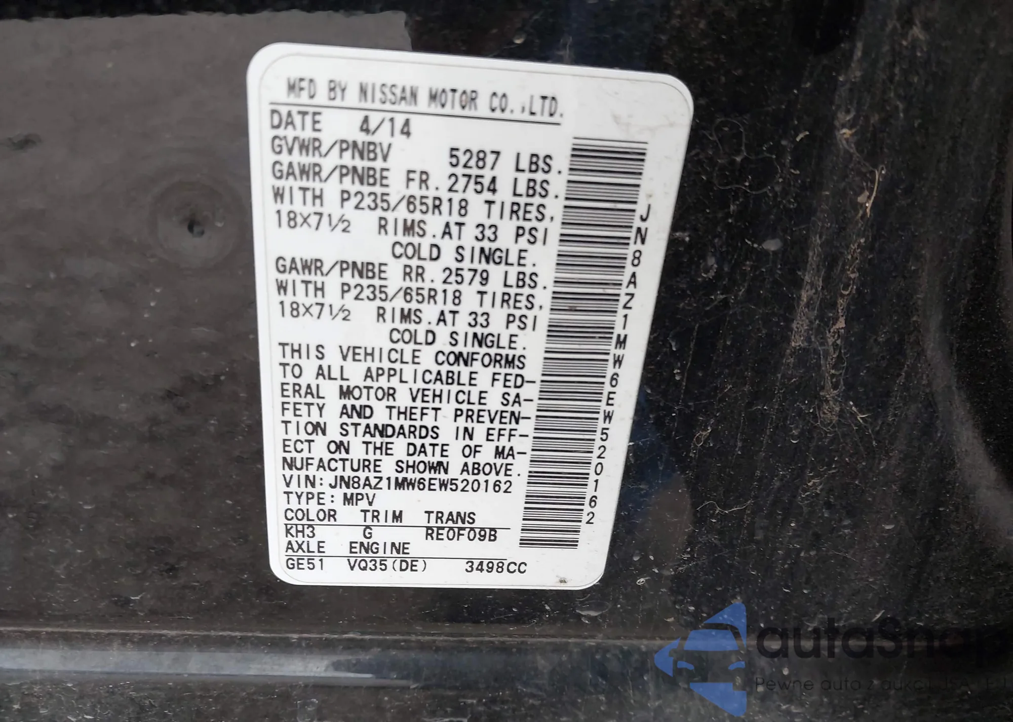 • VIN JN8AZ1MW6EW520162