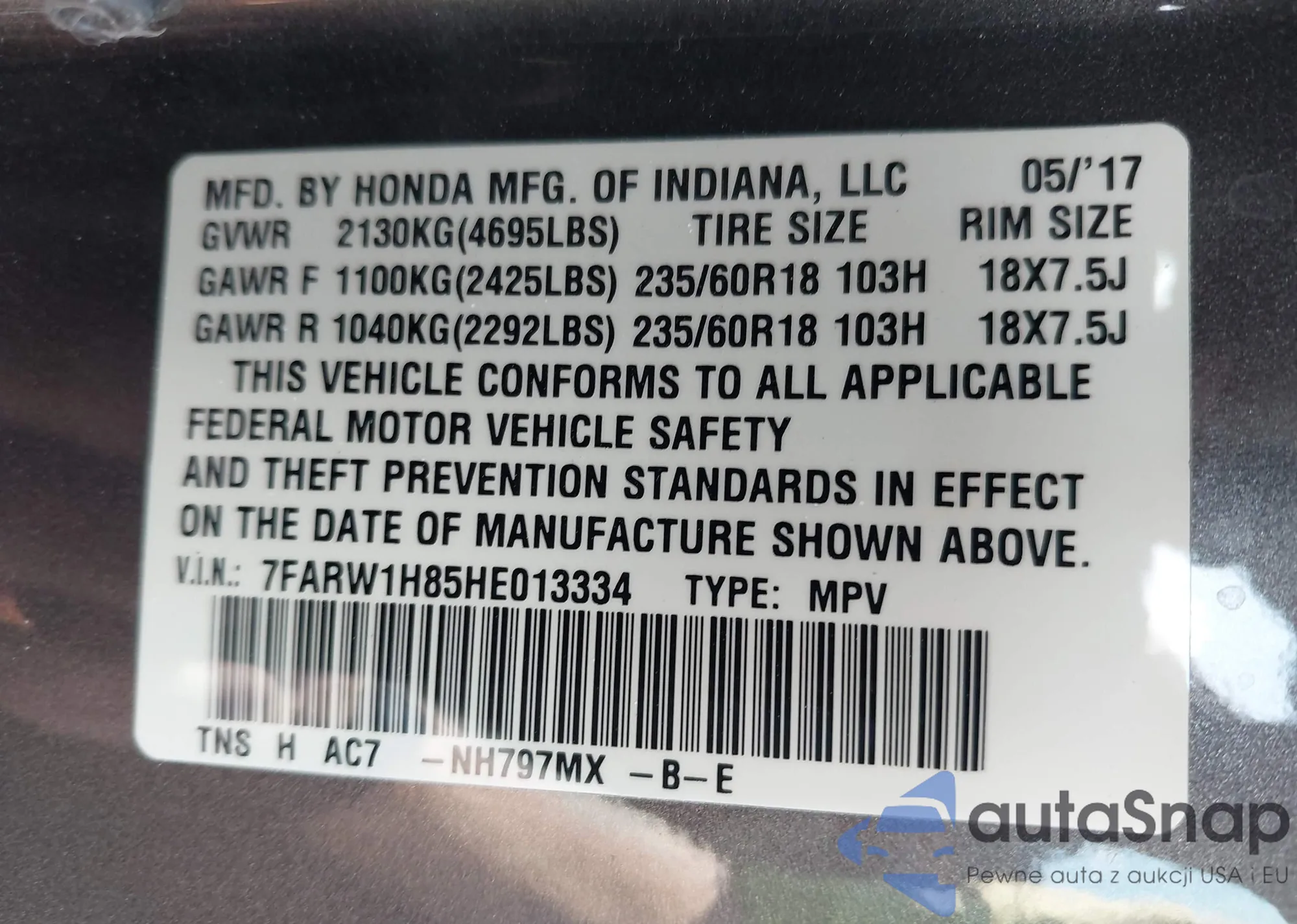 LOT: 43359130 VIN: 7FARW1H85HE013334