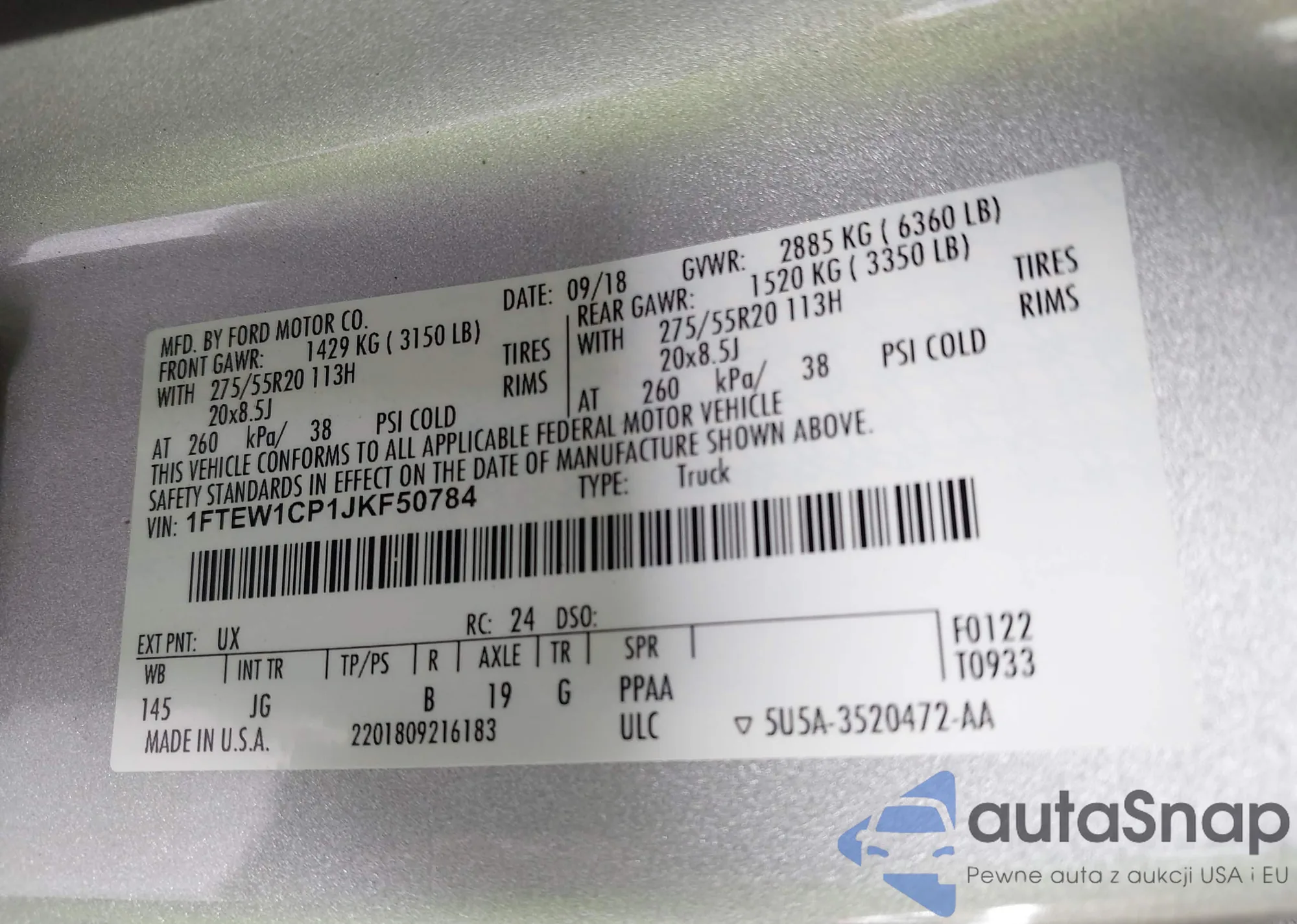 LOT: 43400655 VIN: 1FTEW1CP1JKF50784