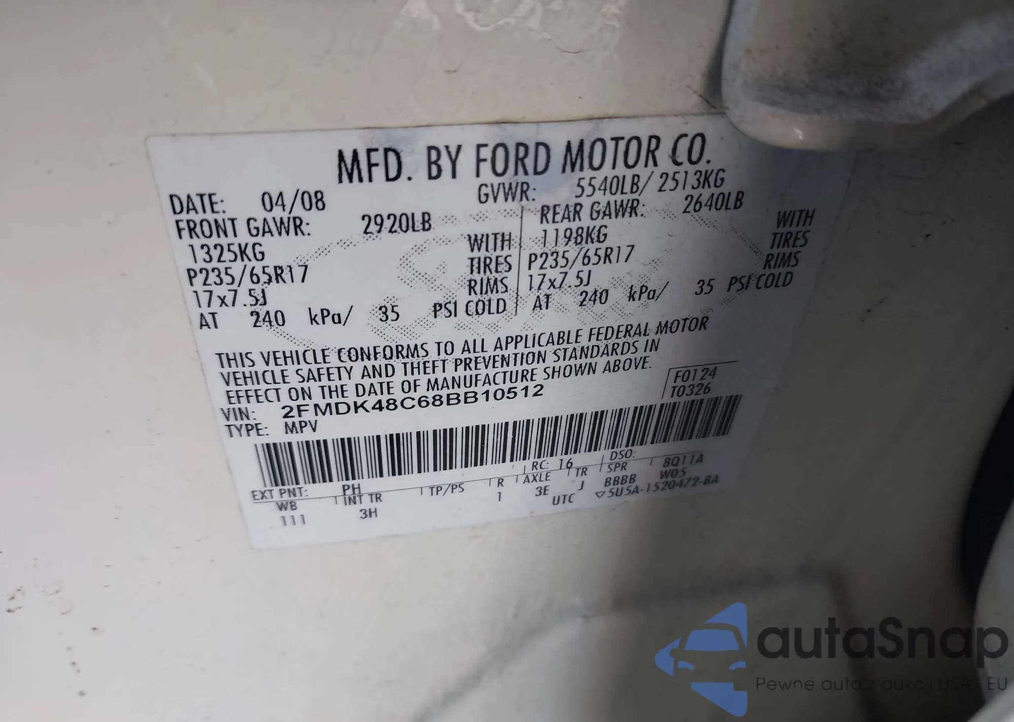 • VIN 2FMDK48C68BB10512
