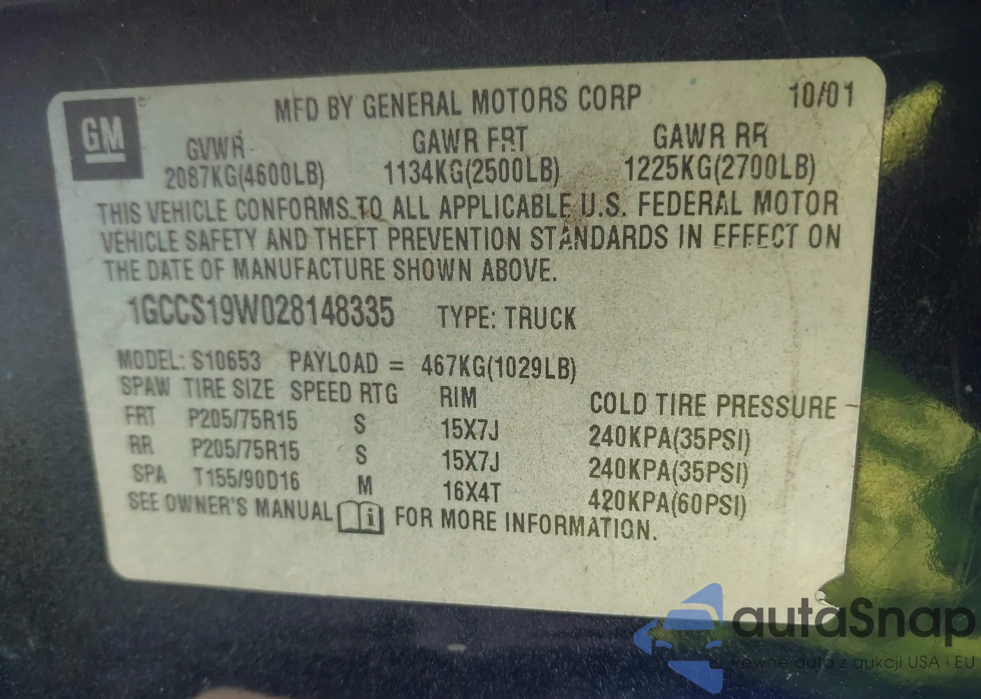 LOT: 43421189 VIN: 1GCCS19W028148335