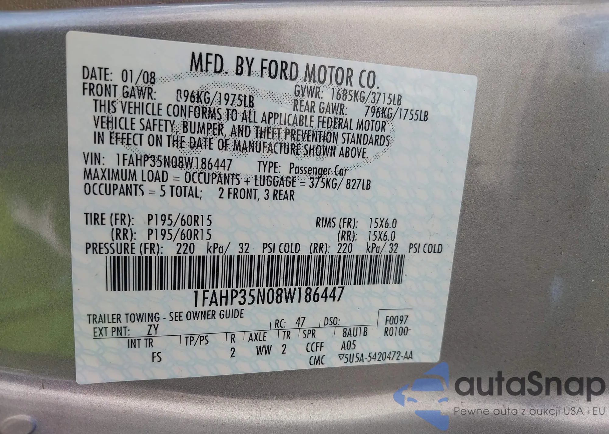 LOT: 43429862 VIN: 1FAHP35N08W186447