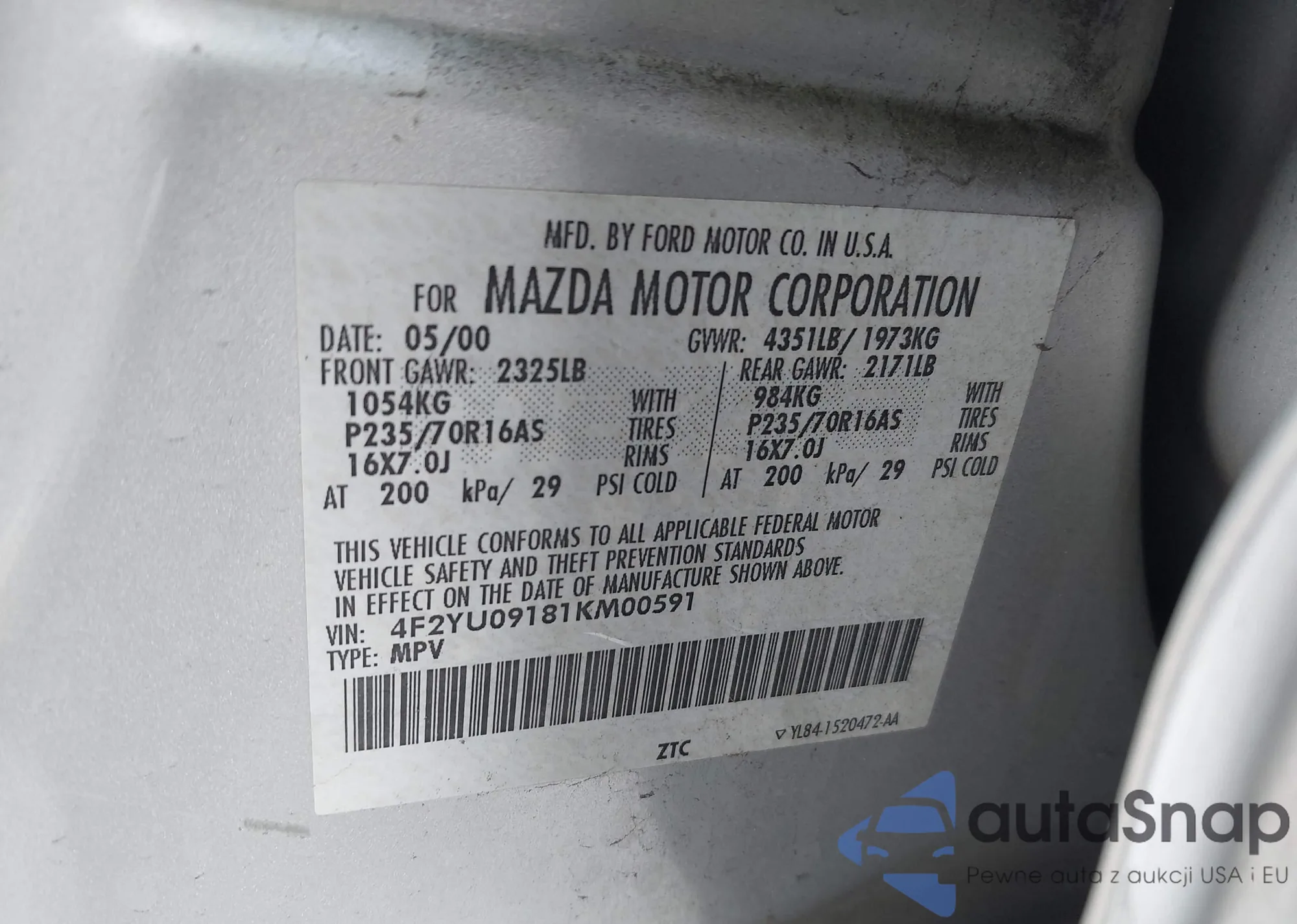 LOT: 43439458 VIN: 4F2YU09181KM00591