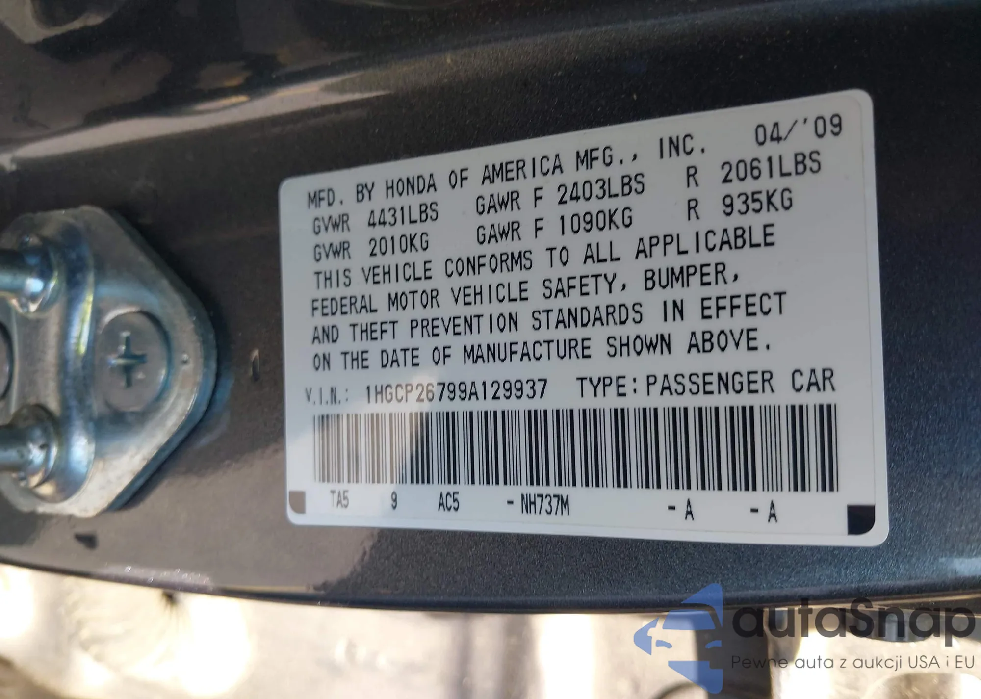 LOT: 43418352 VIN: 1HGCP36868A000602