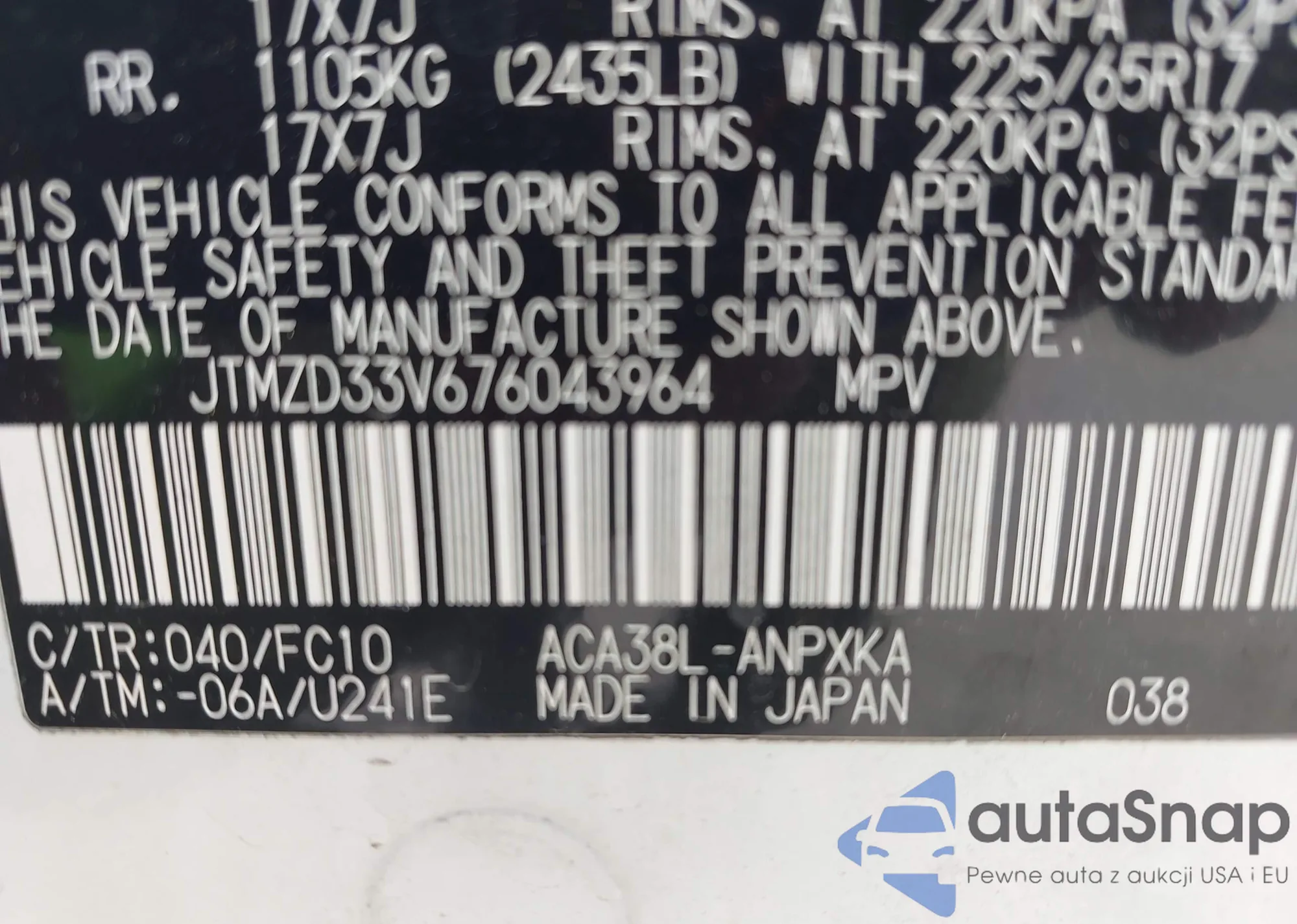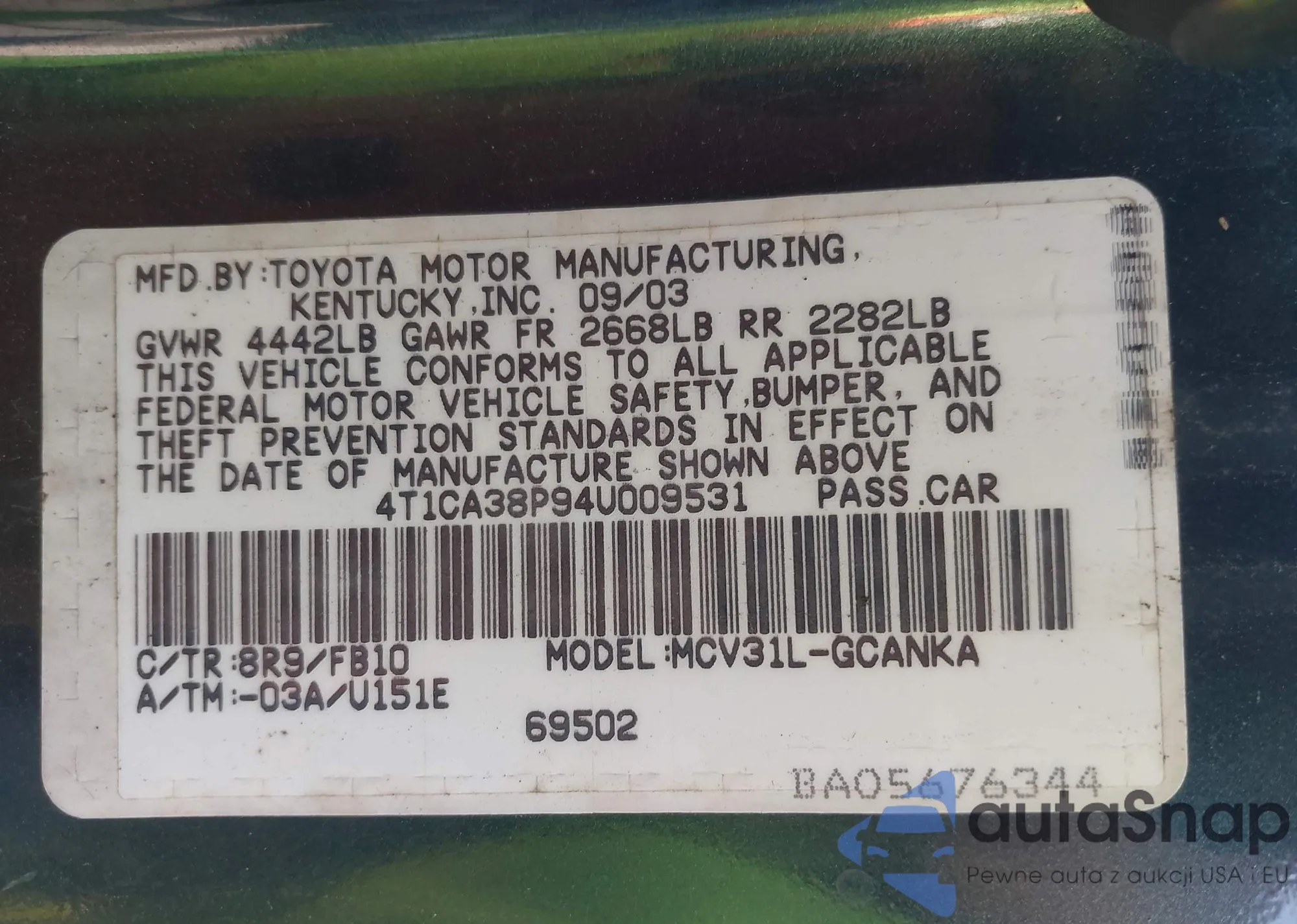 LOT: 43483011 VIN: 4T1CA38P94U009531