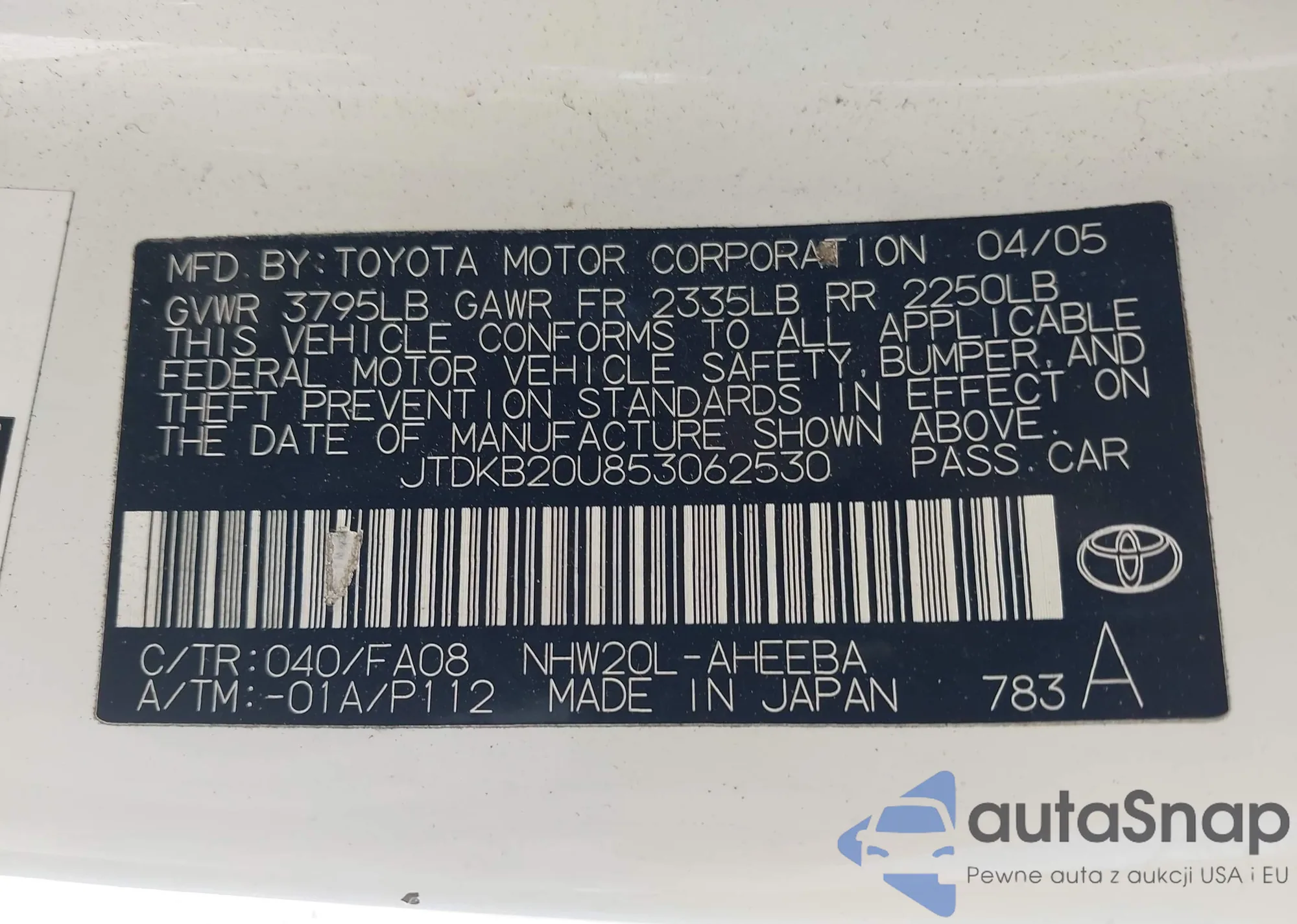 LOT: 43499184 VIN: JTDKB20U853062530