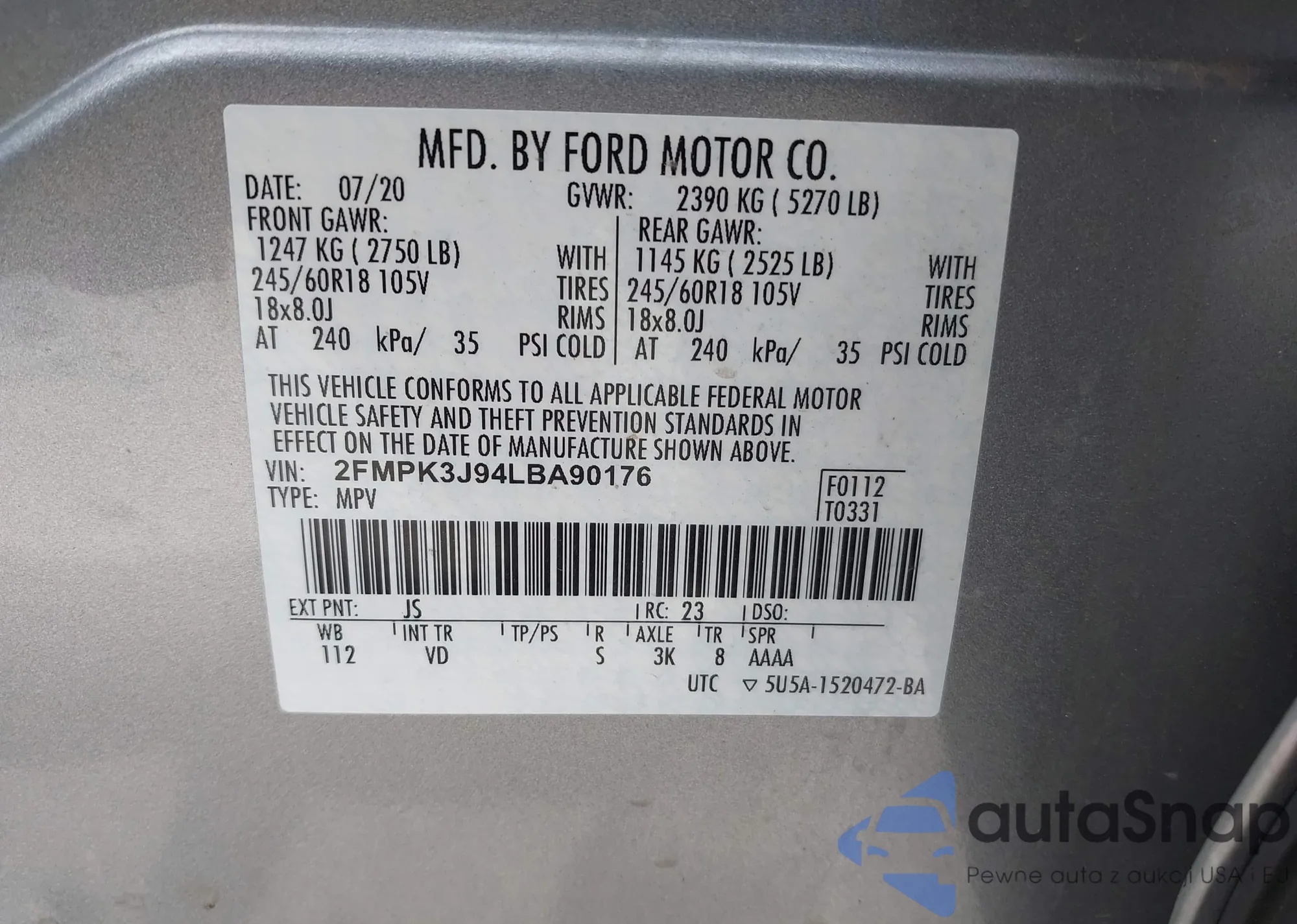 • VIN 1FMCU9HD5KUA50882