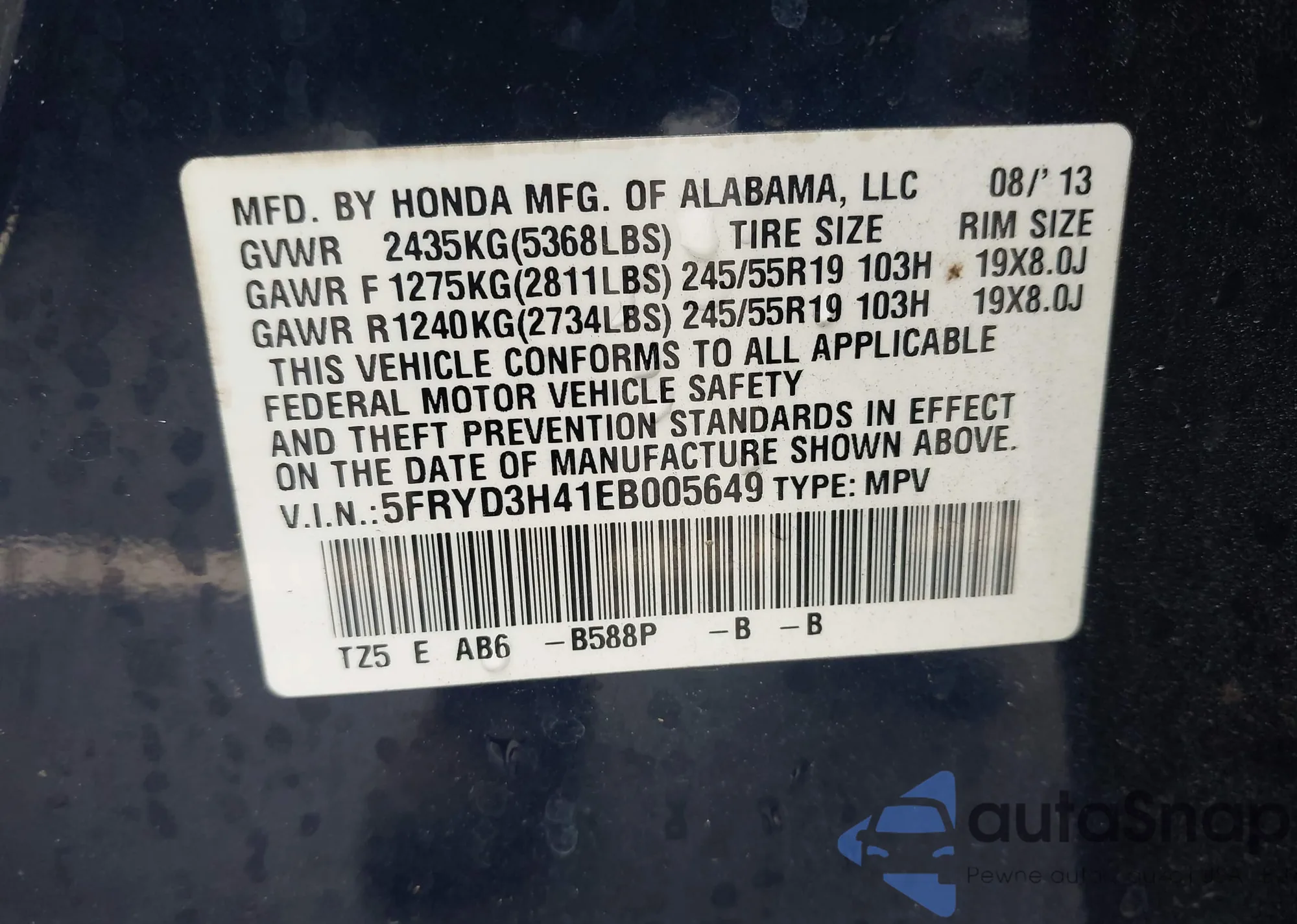 • VIN 5FNYF4H48BB073203