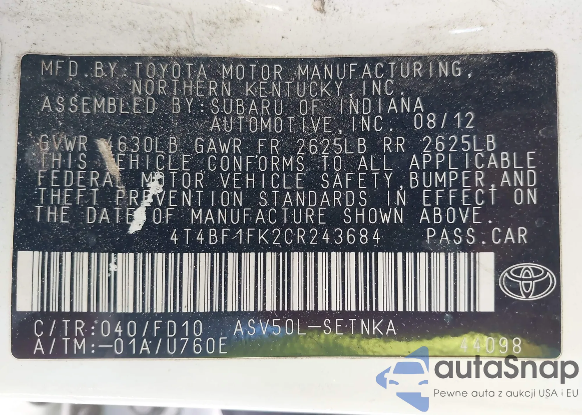 LOT: 43572411 VIN: 1N4BL4BV6KC253508