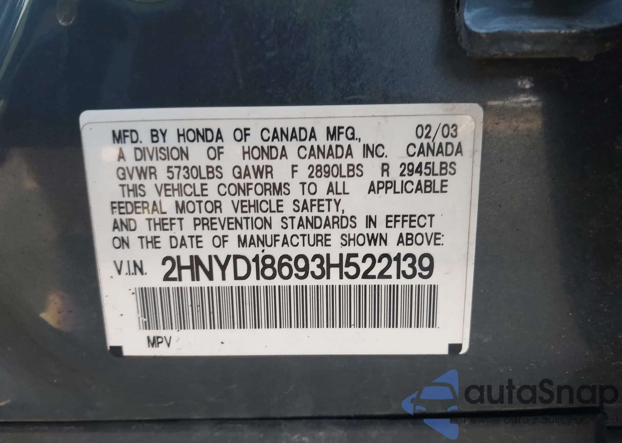 LOT: 43128663 VIN: 2HNYD18693H522139