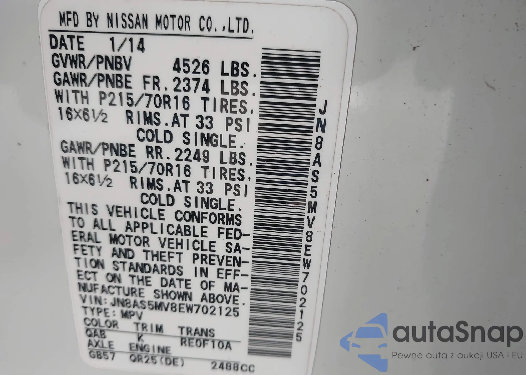 • VIN JN8AS5MV8EW702125