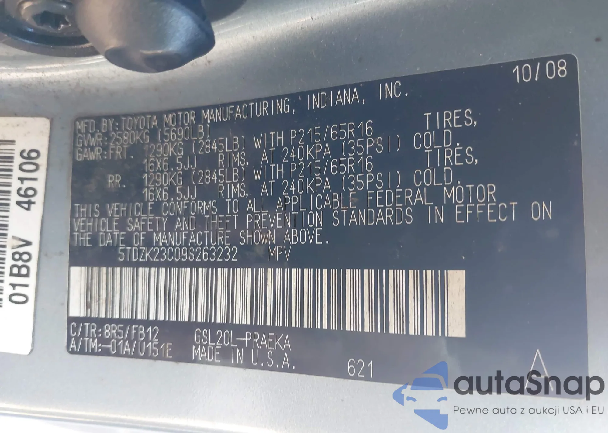 LOT: 43438458 VIN: 5TDZK23C09S263232