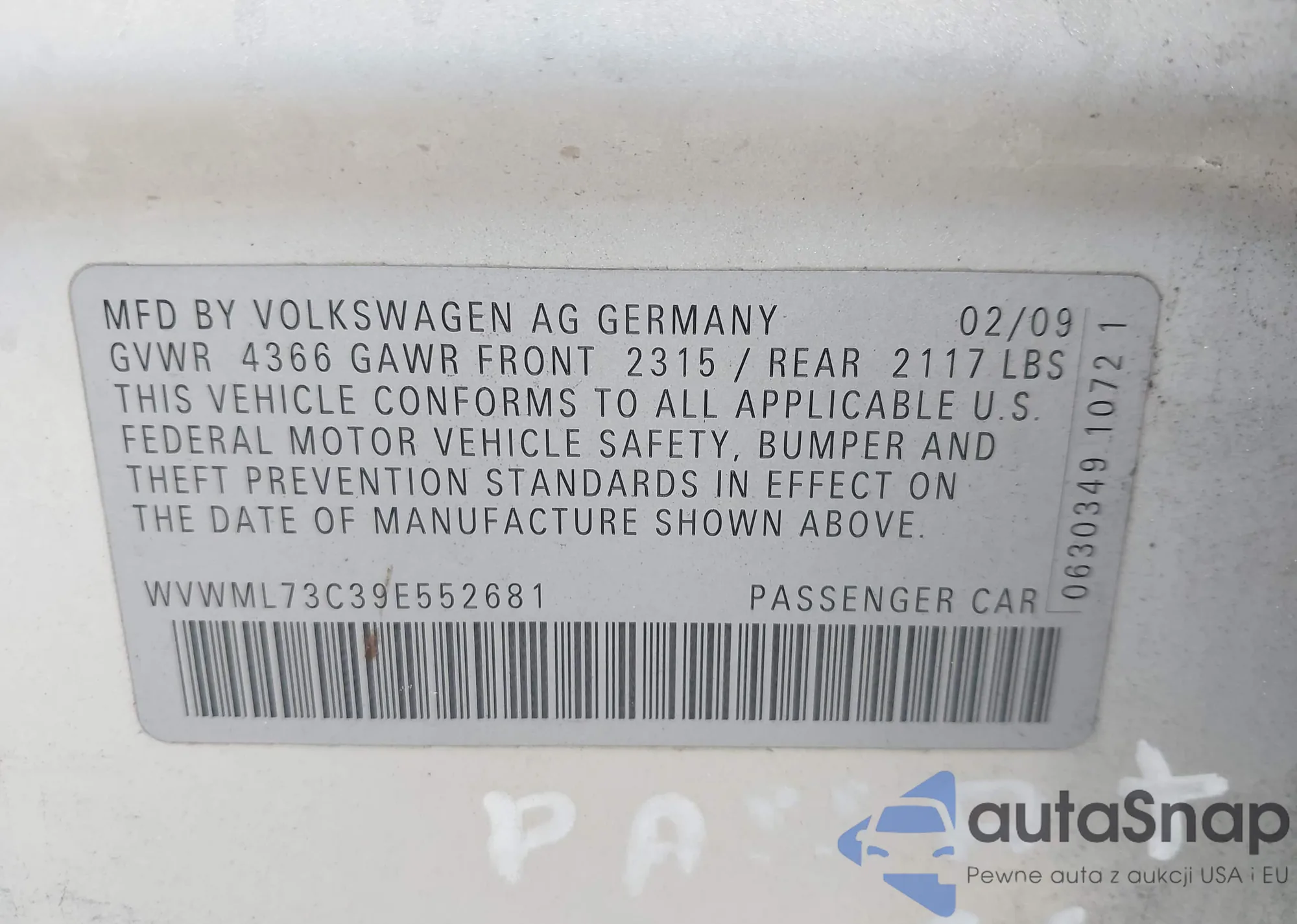 LOT: 43585917 VIN: WVWML73C39E552681