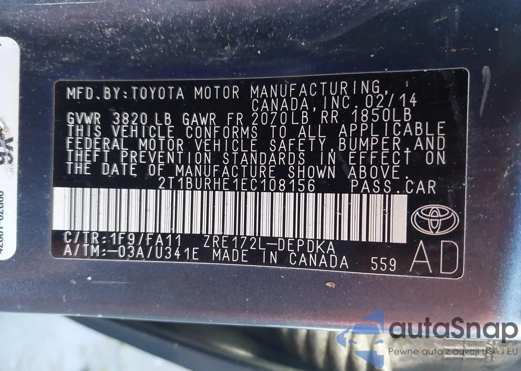 LOT: 43424362 VIN: 2T1BURHE1EC108156