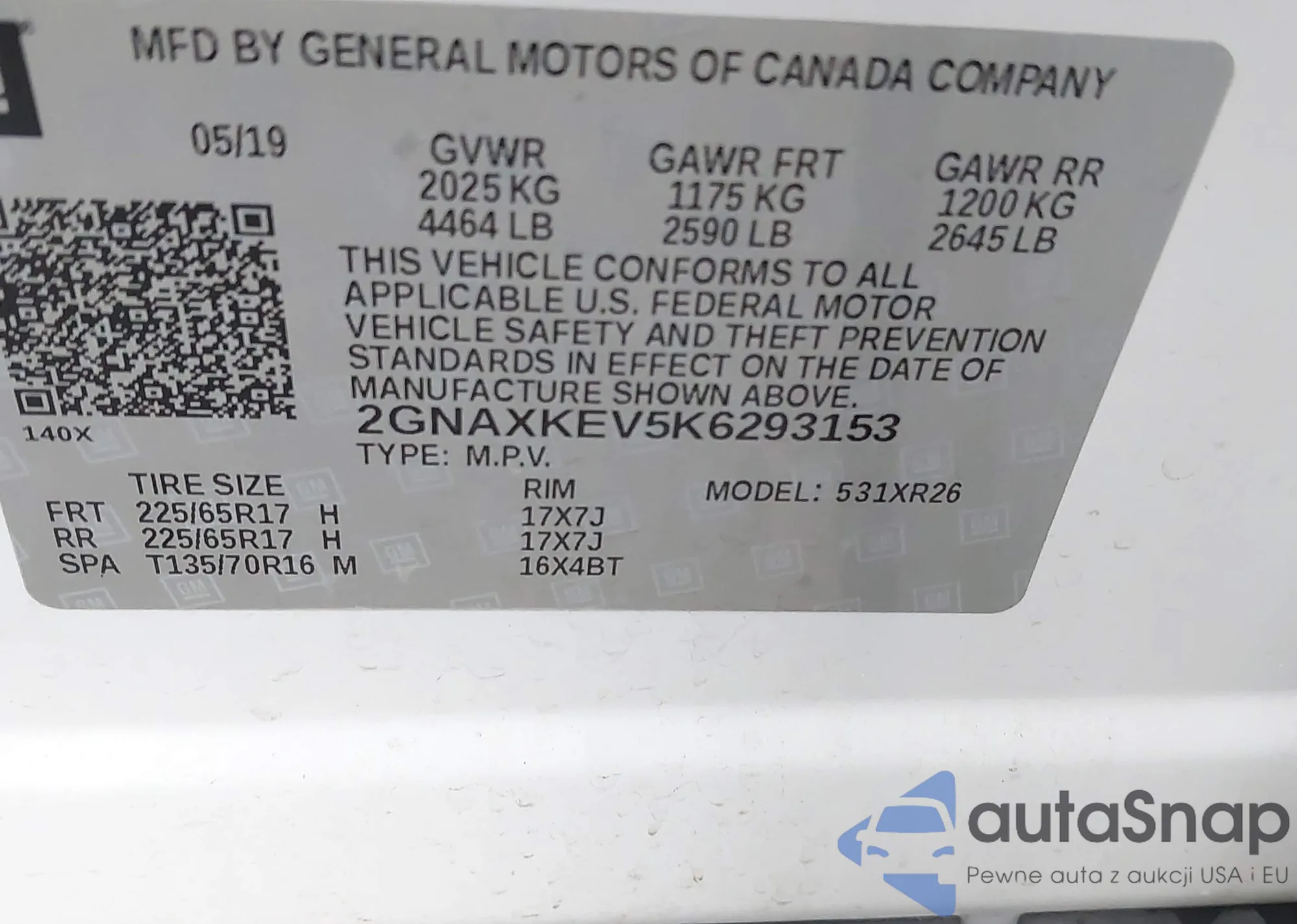LOT: 43501839 VIN: 2GNAXKEV5K6293153