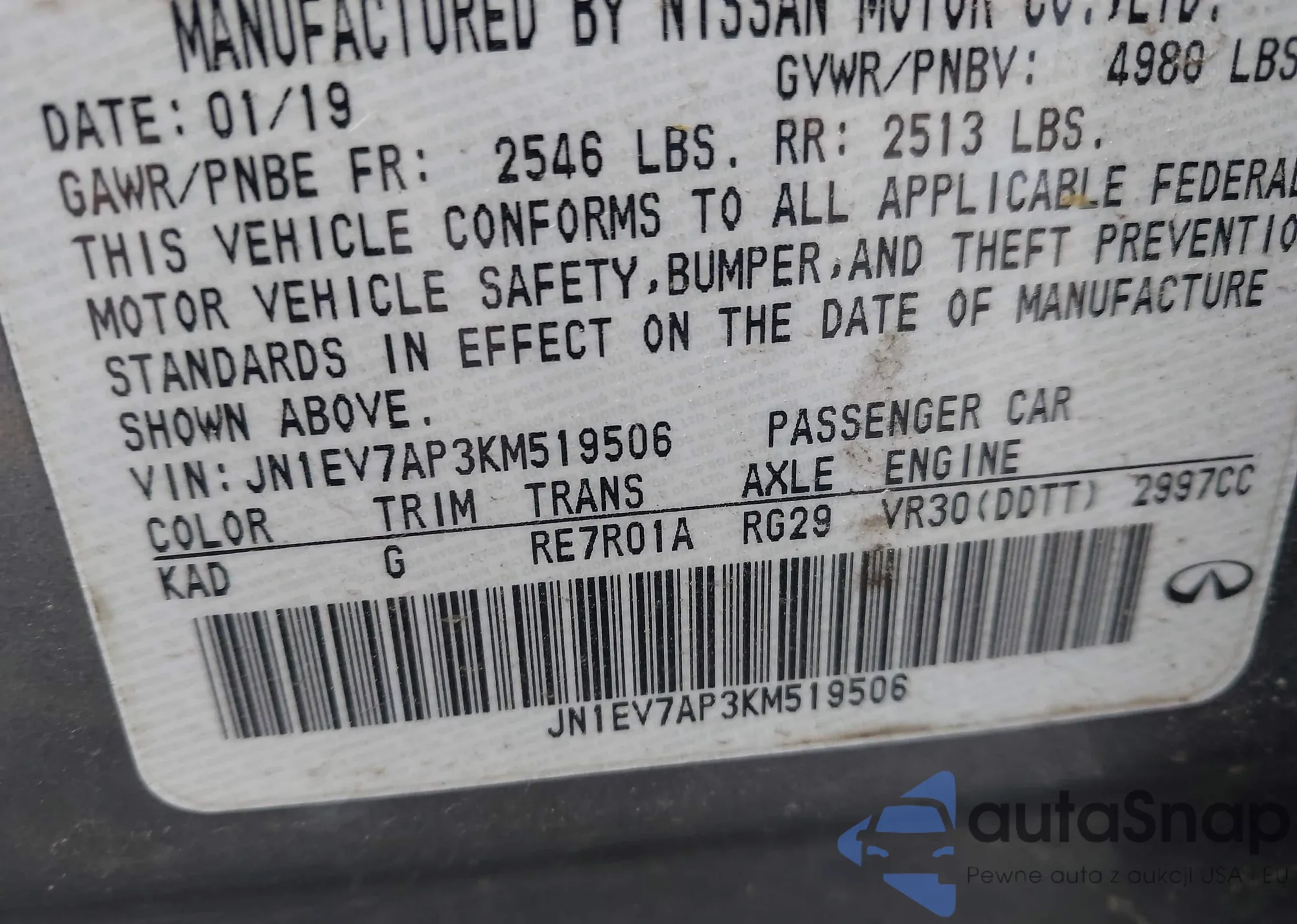LOT: 43625250 VIN: 1N4BL4DW8RN318220