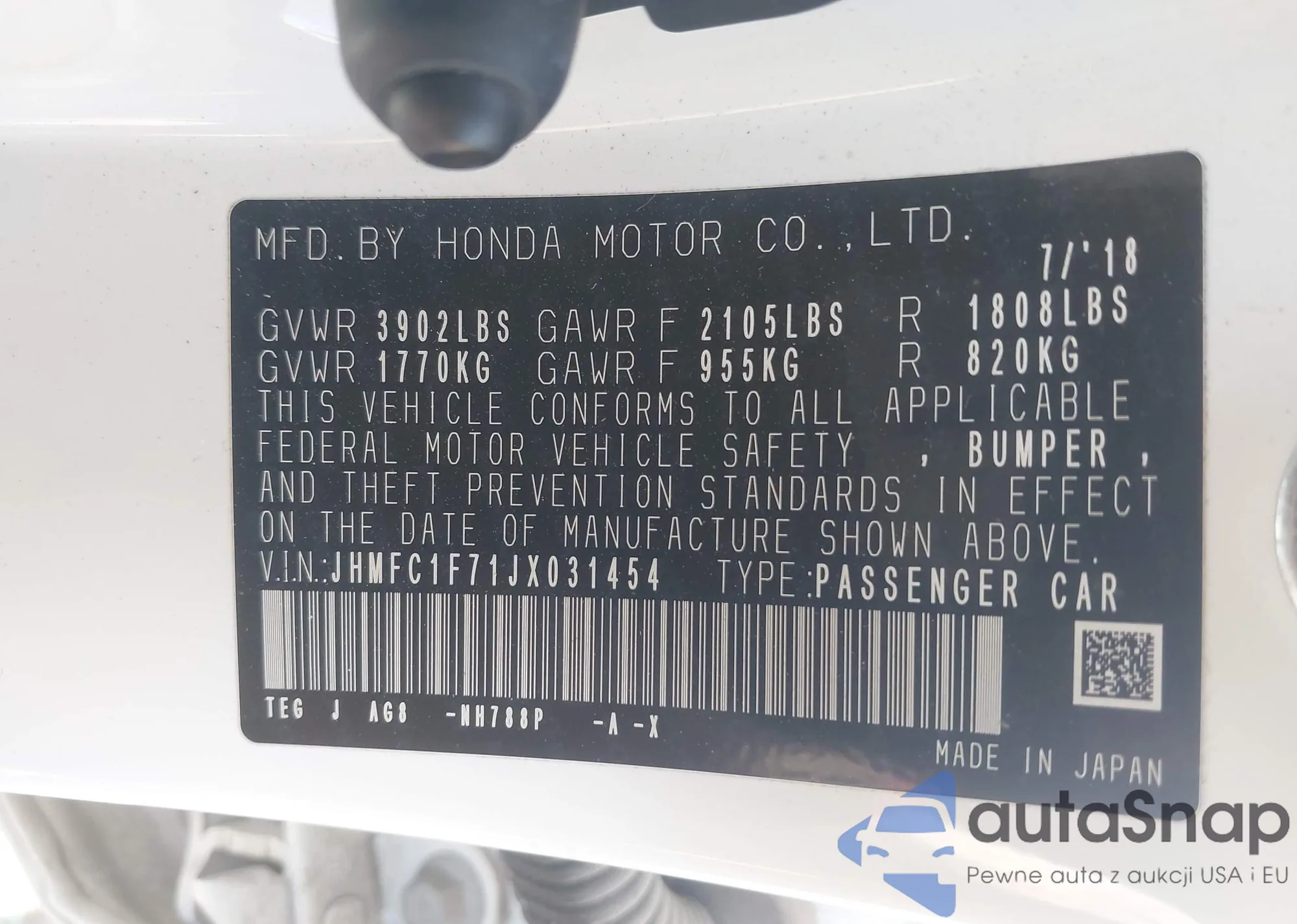 LOT: 43201815 VIN: JHMFC1F71JX031454