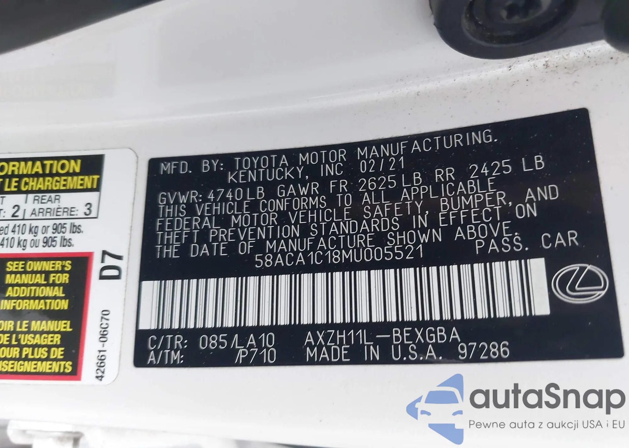 LOT: 43301964 VIN: 58ACA1C18MU005521