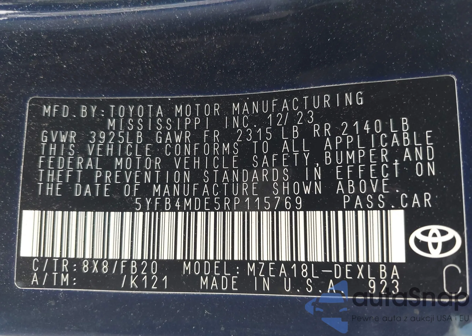 • VIN 5YFB4MDE5RP115769