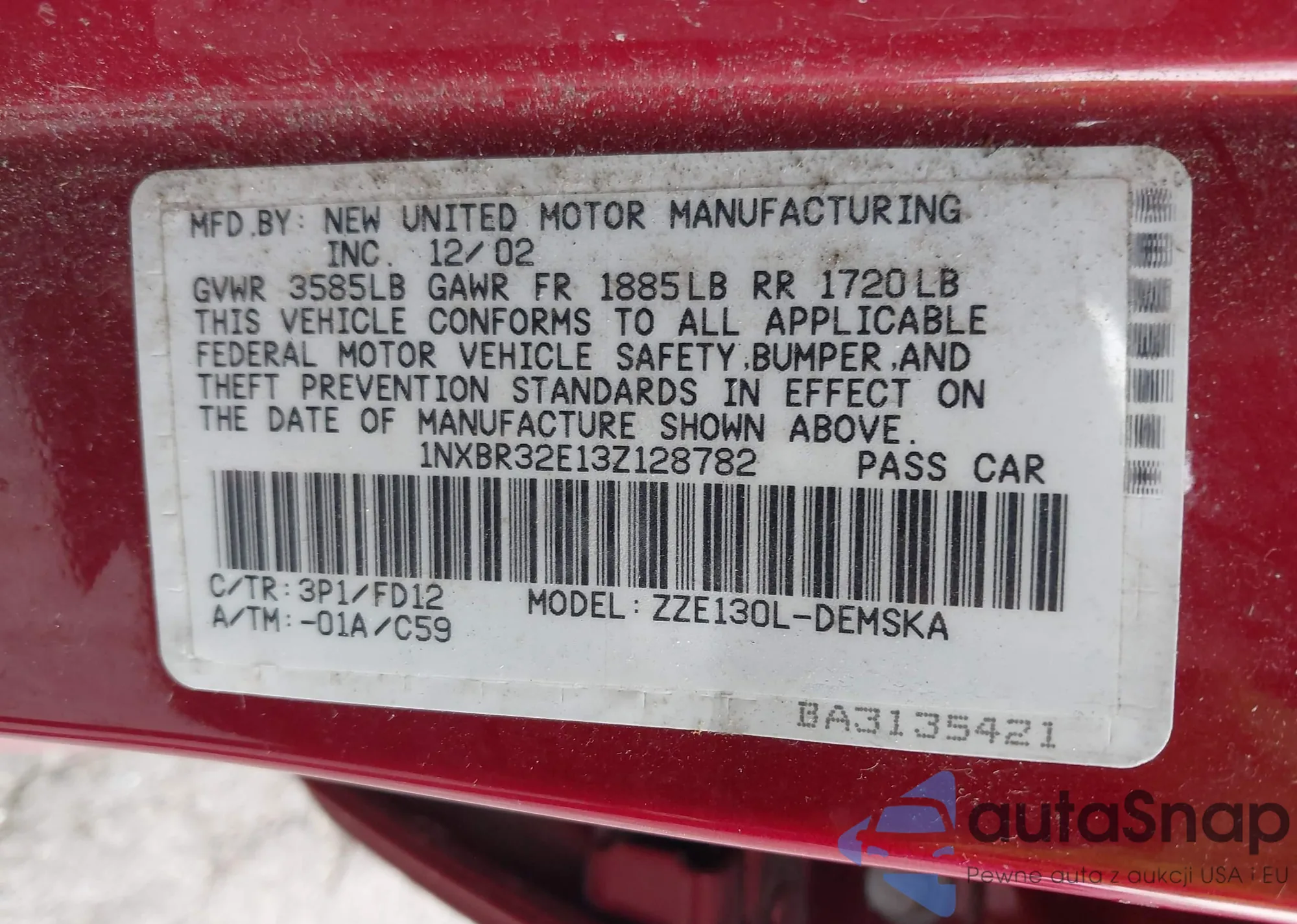 LOT: 43650705 VIN: 1NXBR32E13Z128782