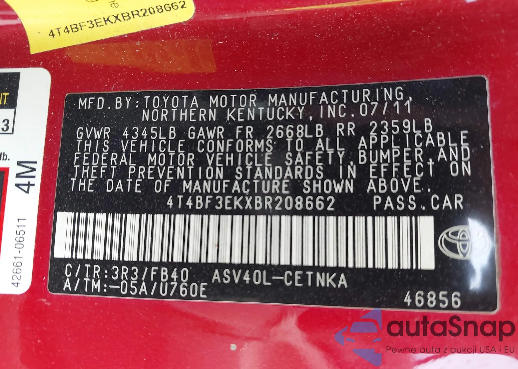 LOT: 43235658 VIN: 4T4BF3EKXBR208662