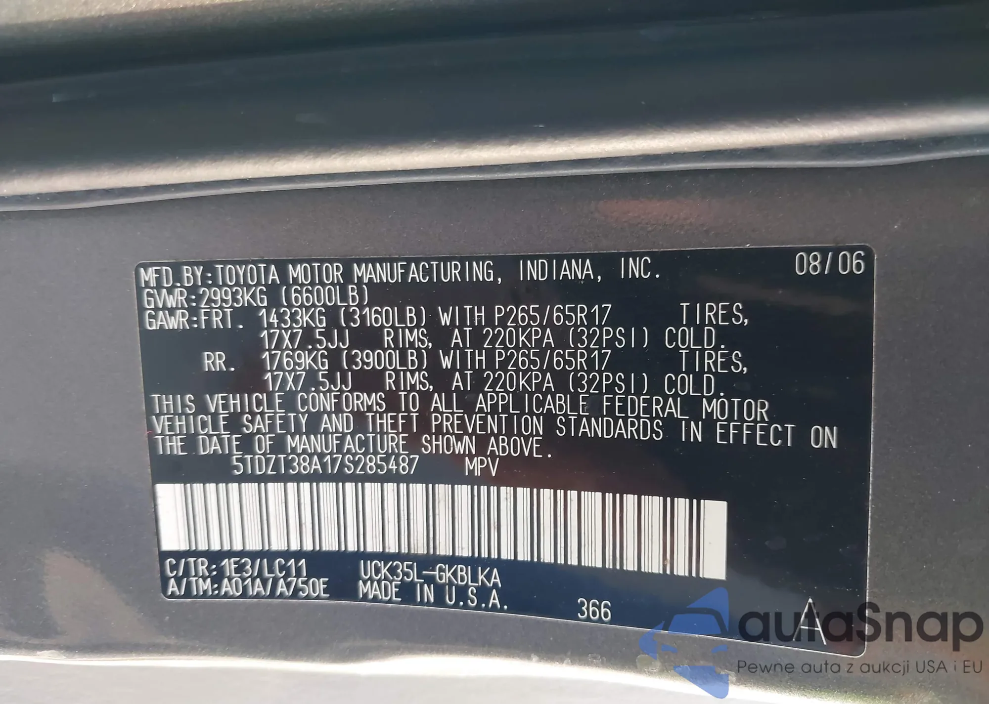 LOT: 43459443 VIN: 5TDZT38A17S285487