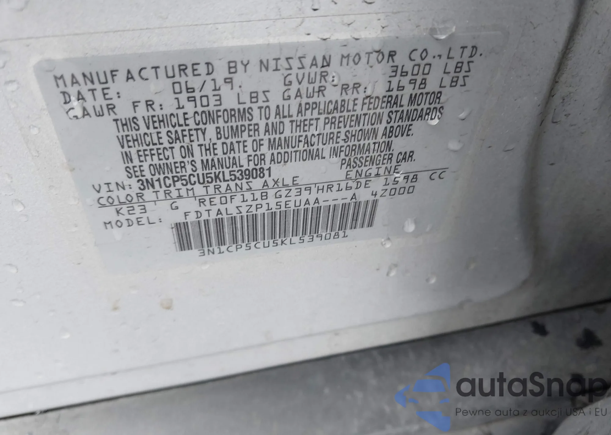 LOT: 43559531 VIN: 1G1ZB5ST1KF211450