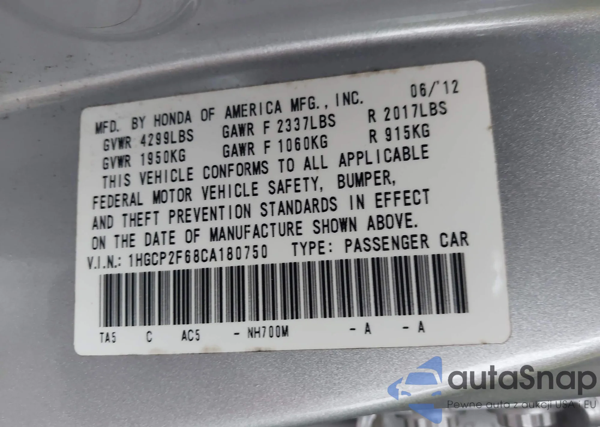 LOT: 43380420 VIN: 1HGCP2F68CA180750