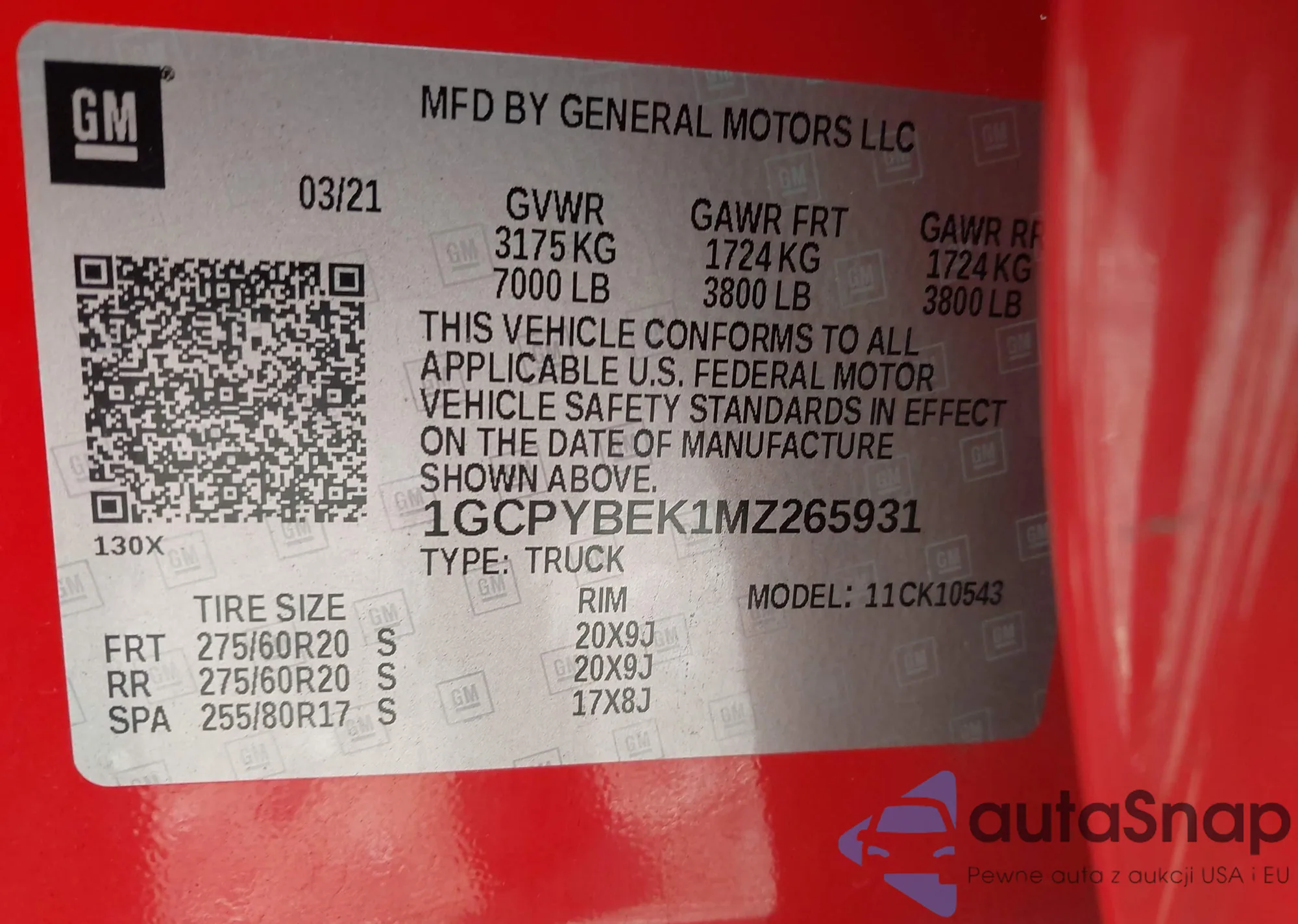LOT: 43567463 VIN: 1GCPYBEK1MZ265931