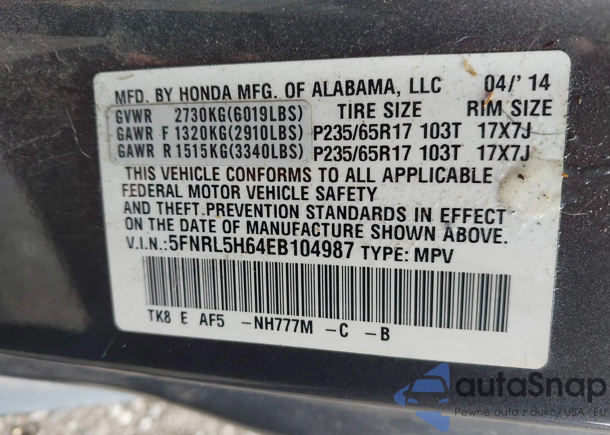 • VIN 5FNRL5H64EB104987