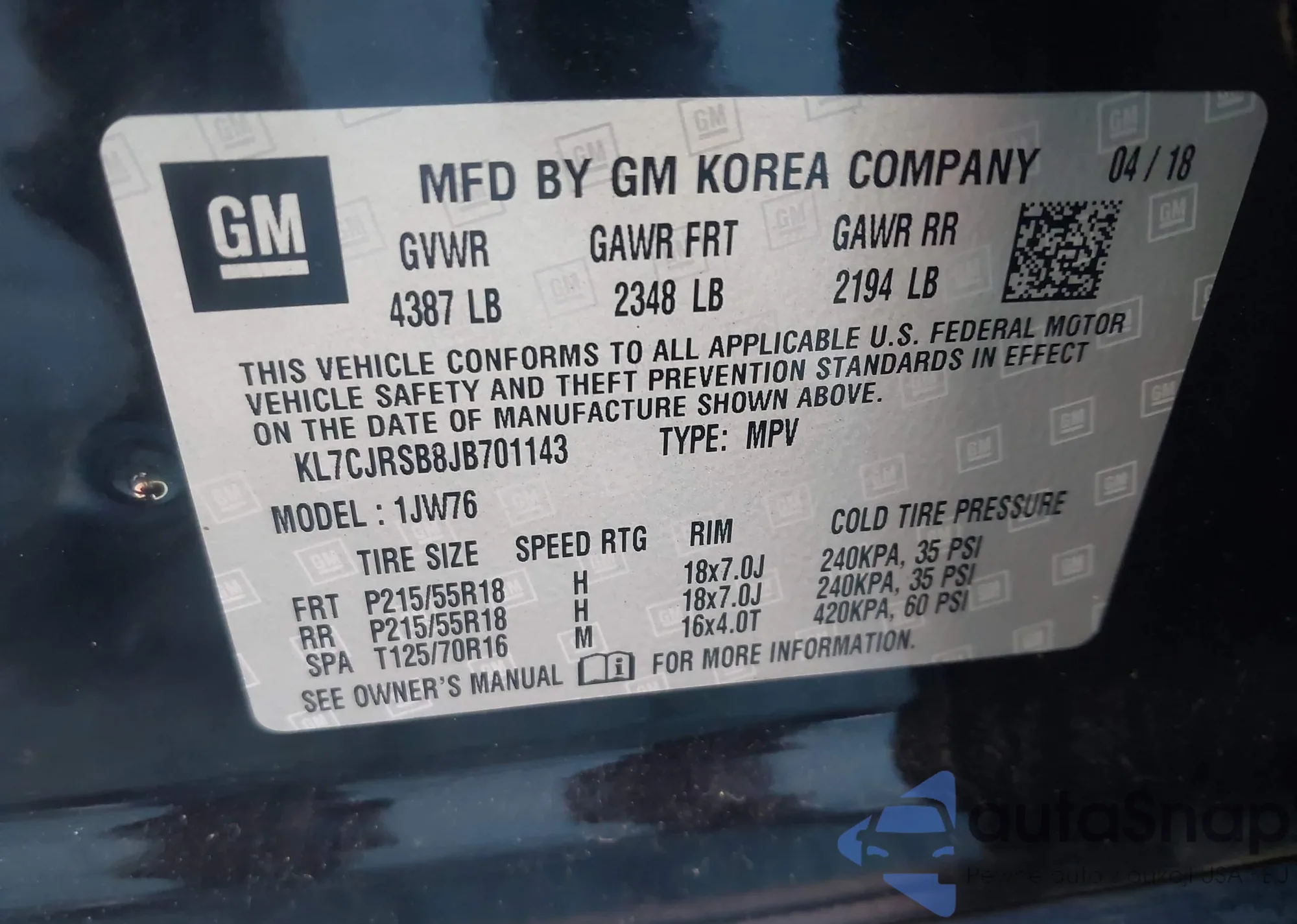 • VIN KL7CJRSB8JB701143
