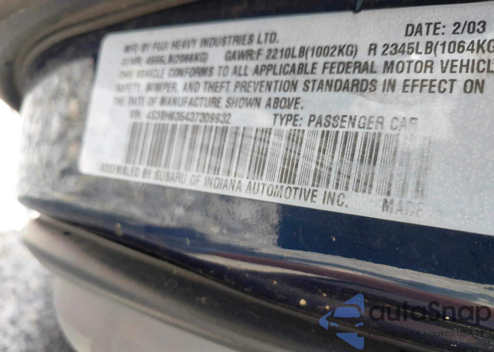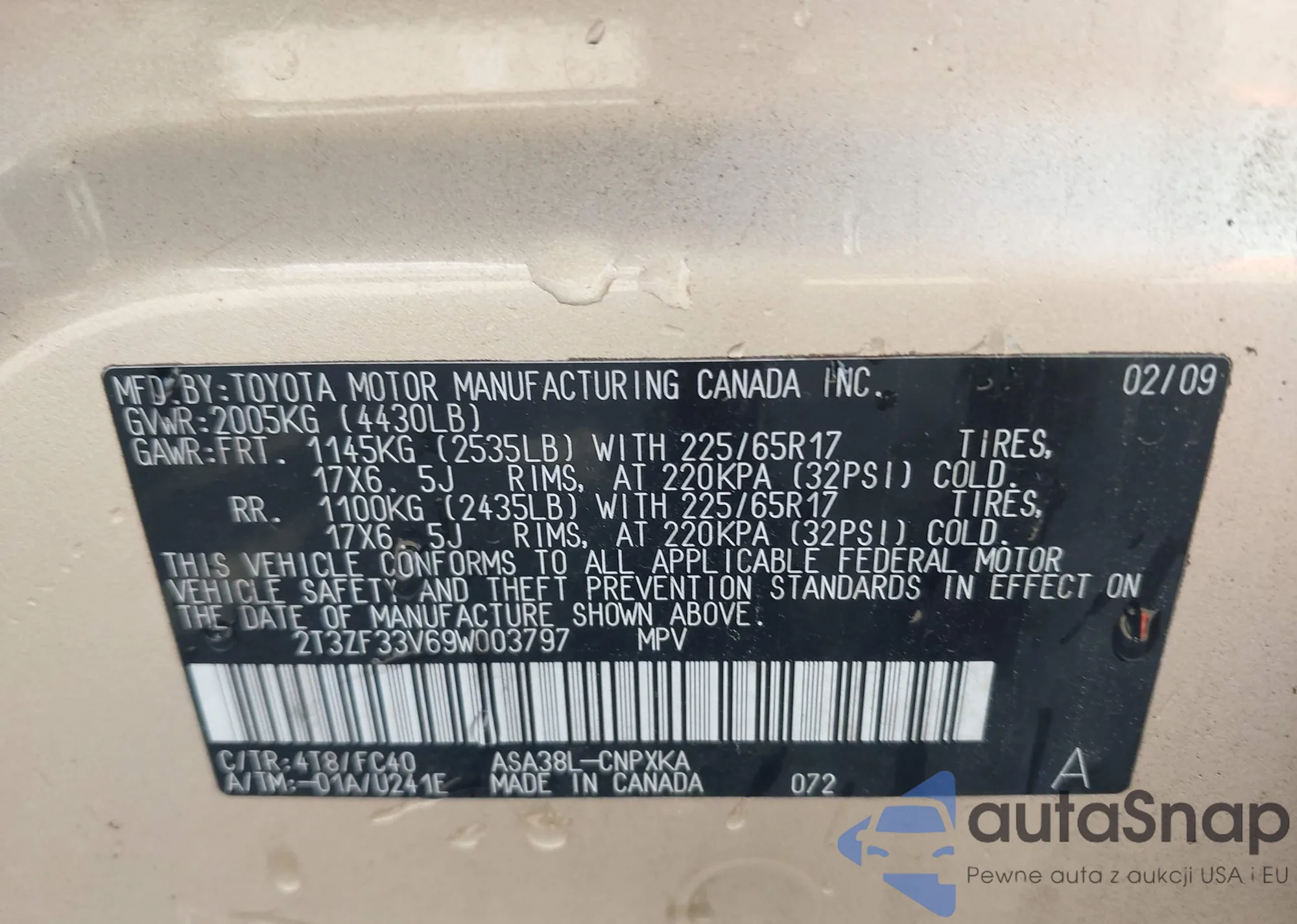 LOT: 43237826 VIN: 2T3ZF33V69W003797