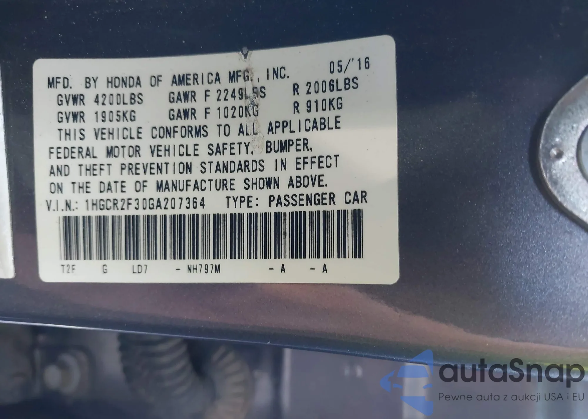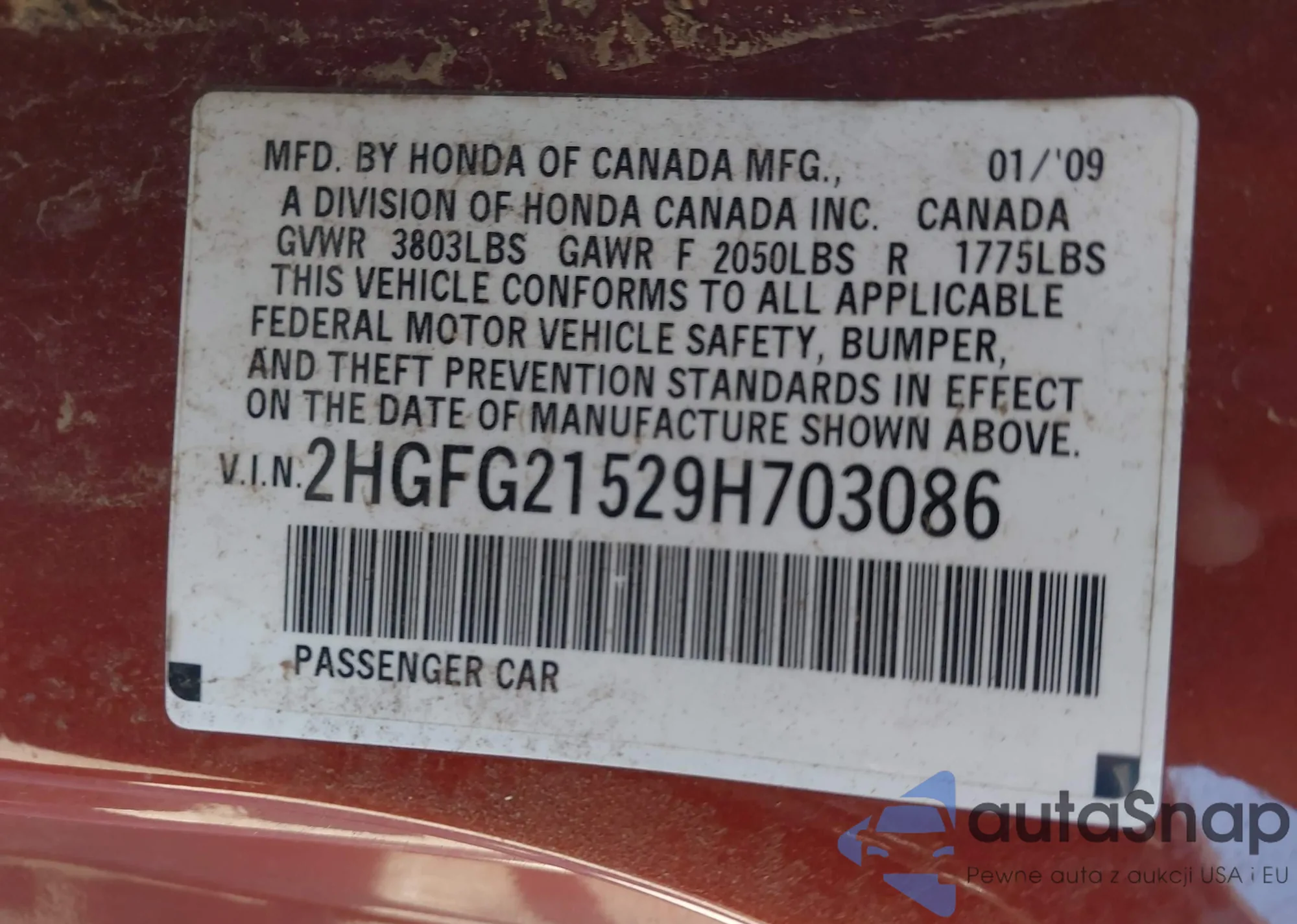 LOT: 43453722 VIN: 2HGFG21529H703086