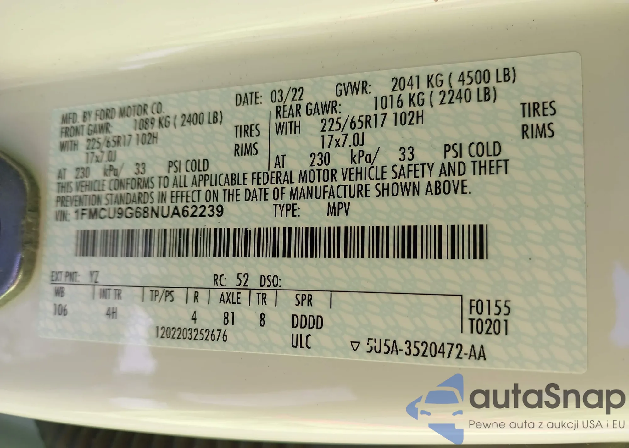 LOT: 43460931 VIN: 1FMCU9G68NUA62239