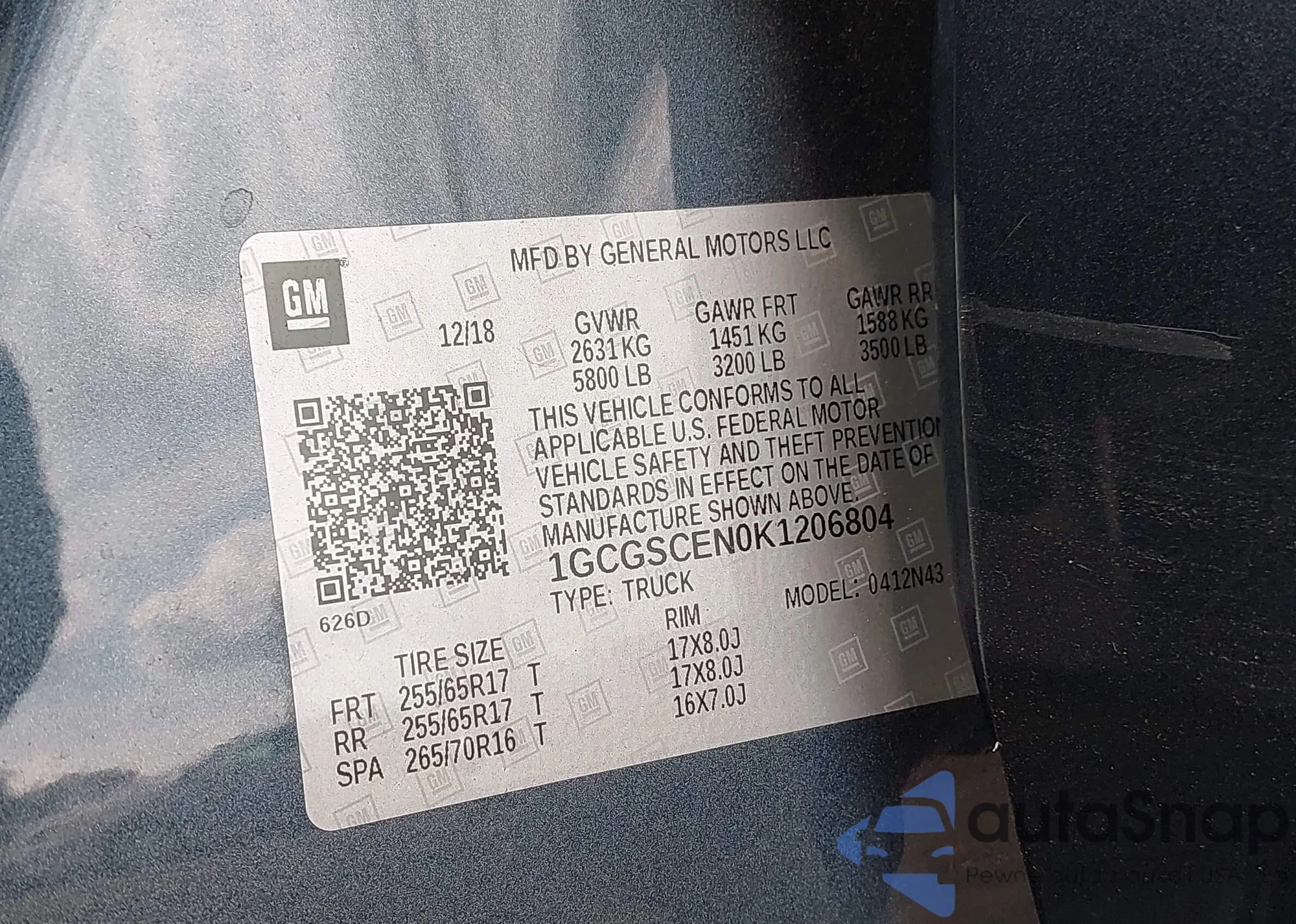 LOT: 43296788 VIN: 1GCGSCEN0K1206804