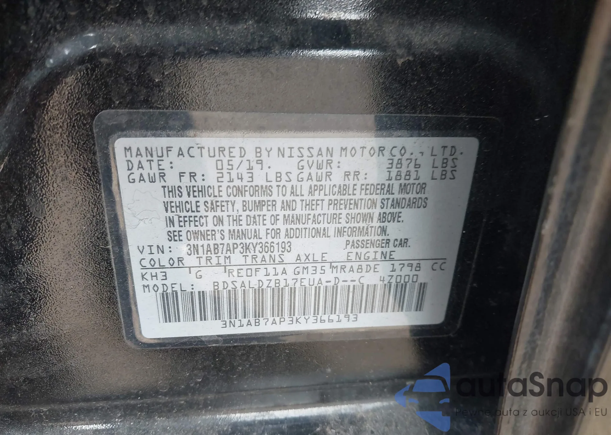 LOT: 43623501 VIN: 3N1AB7AP3KY366193