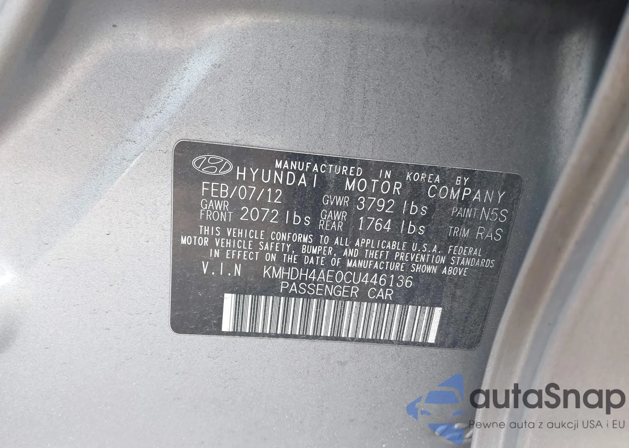 LOT: 43544262 VIN: KMHTC6AD3GU276972