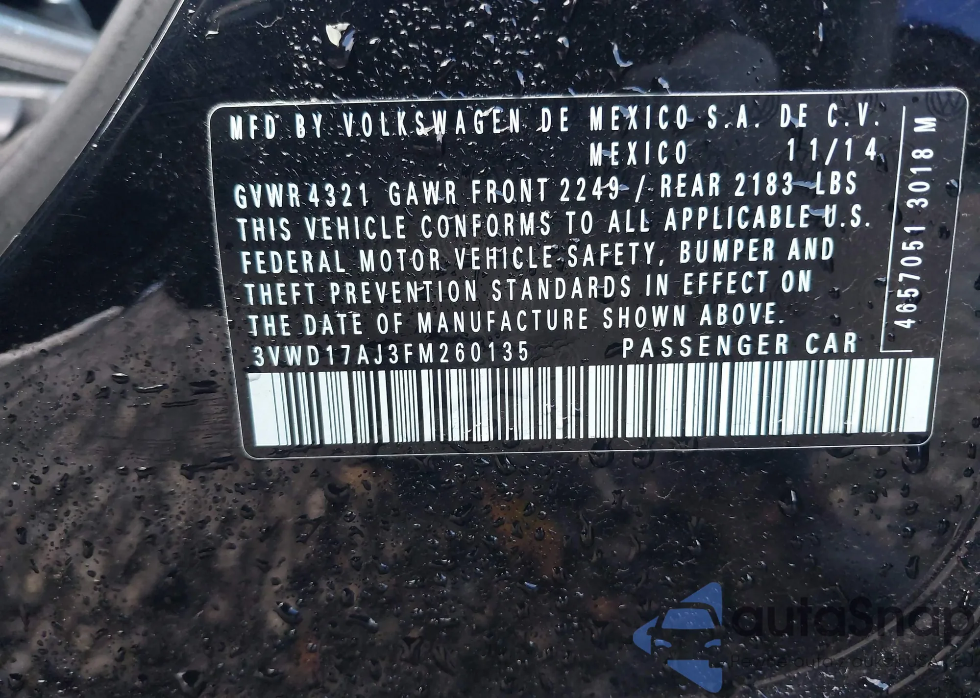 • VIN 3VWD17AJ3FM260135
