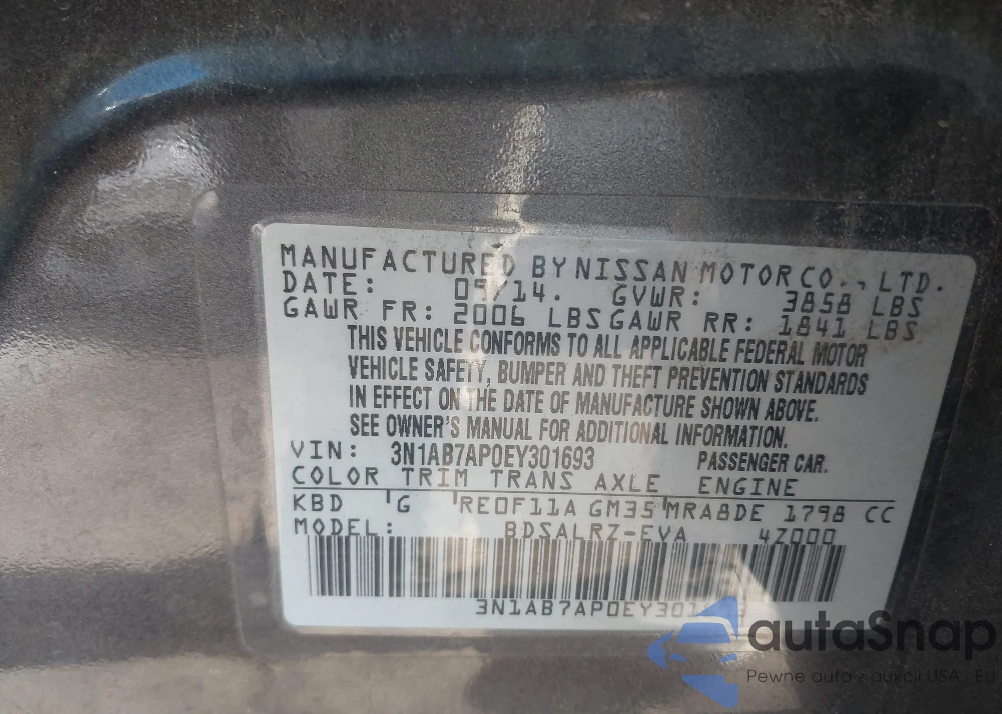 • VIN 3N1AB7AP0EY301693