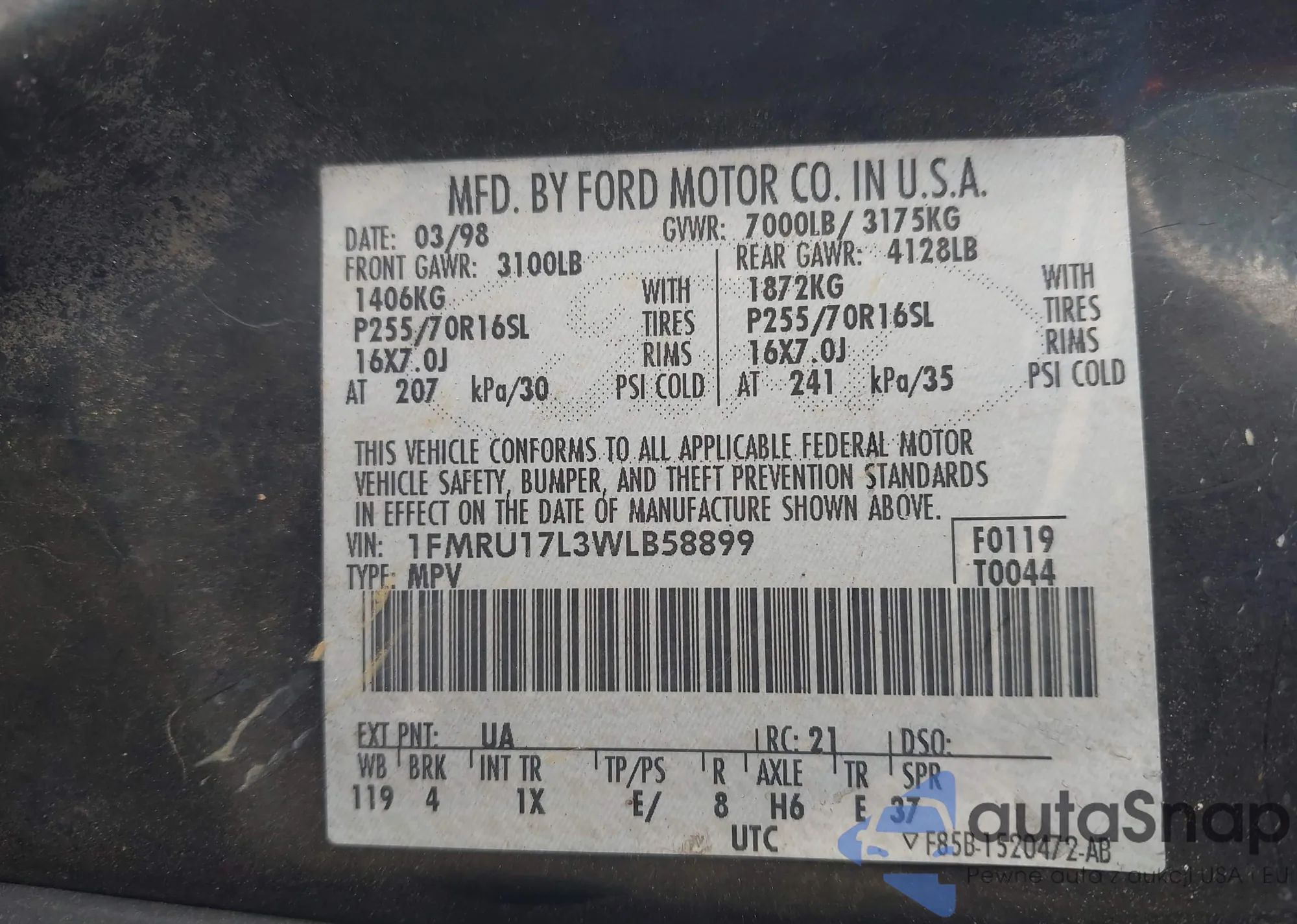 • VIN 1FMRU17L3WLB58899