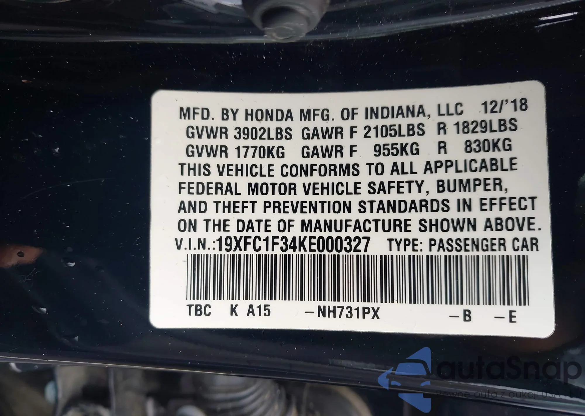 • VIN 19XFC1F34KE000327